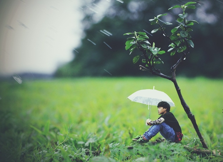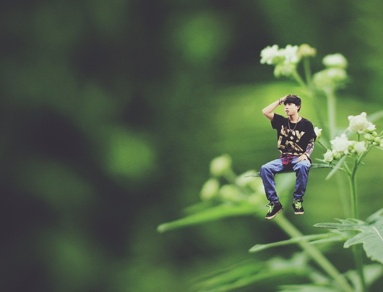Vì vậy, cậu hóa thân thành người tí hon, rong chơi giữa màu xanh bạt ngàn của thiên nhiên. |
