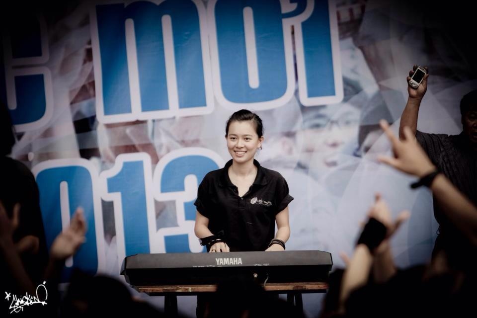 | Kiều My chơi đàn tại một sự kiện âm nhạc. |