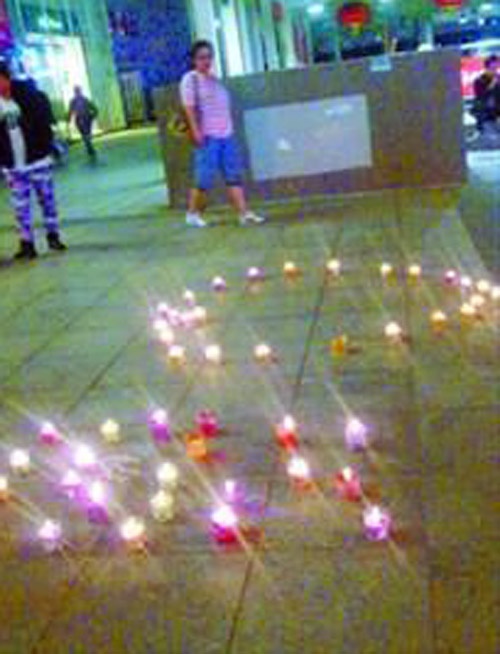 Sự việc diễn ra 20h30 tối qua (6/9) tại phố Thẩm Liêu, TP Thẩm Dương, tỉnh Liêu Ninh, Trung Quốc. Một chàng trai trẻ có mặt từ khá sớm hào hứng xếp những cốc nến màu lên vỉa hè trước một cửa hàng bách hóa.