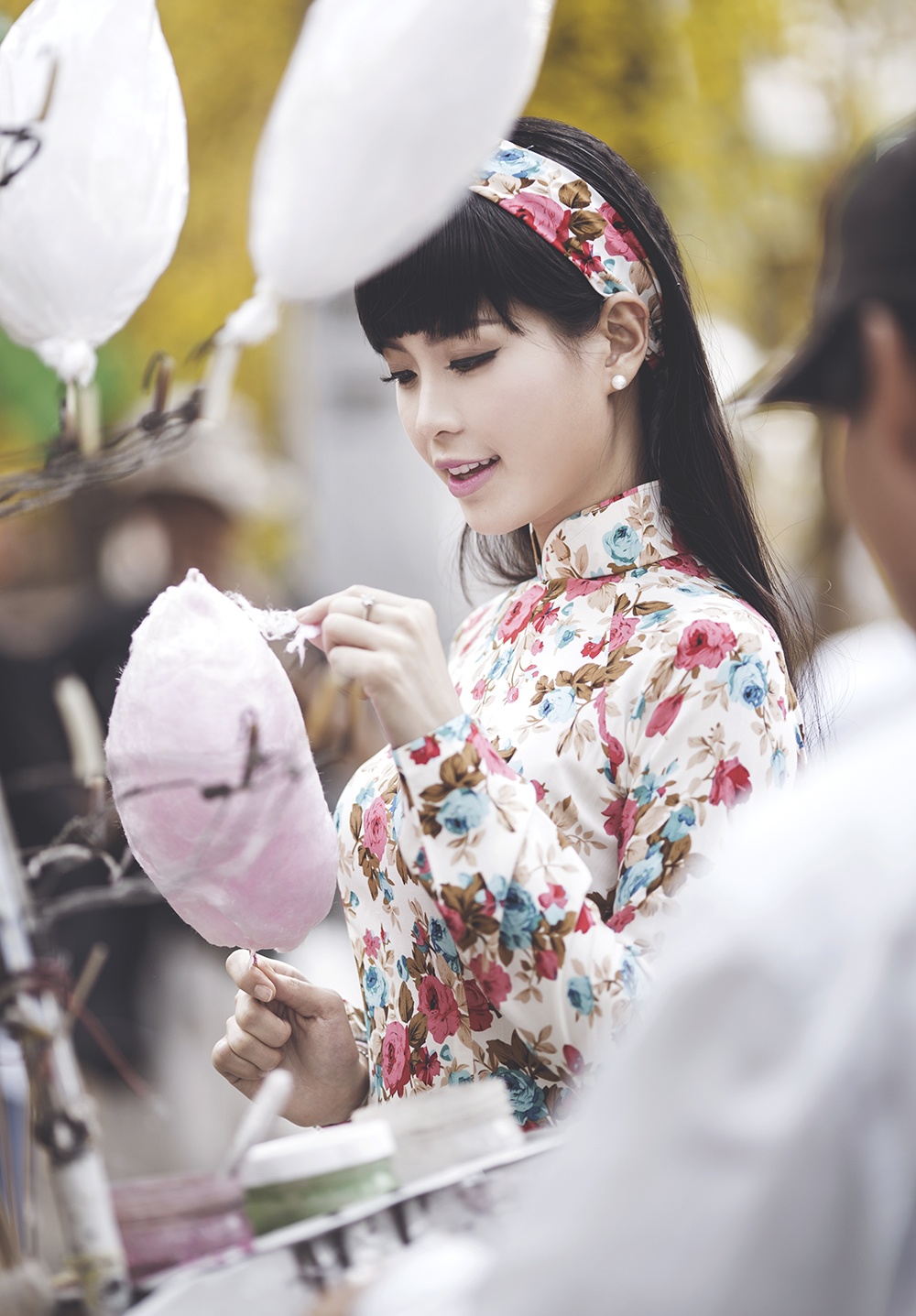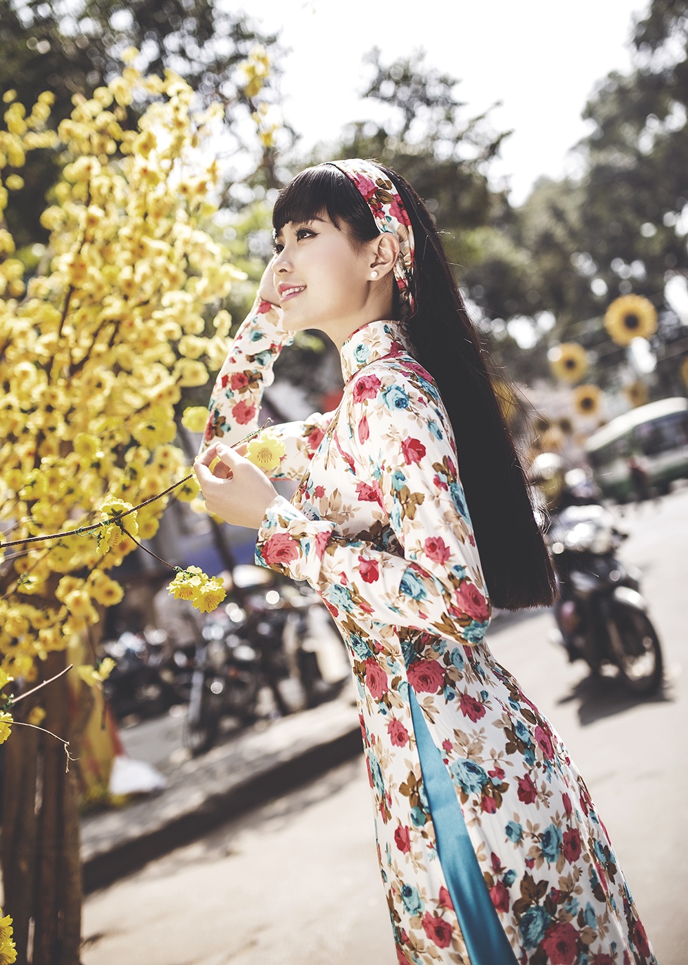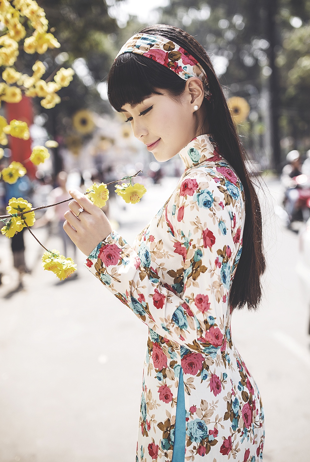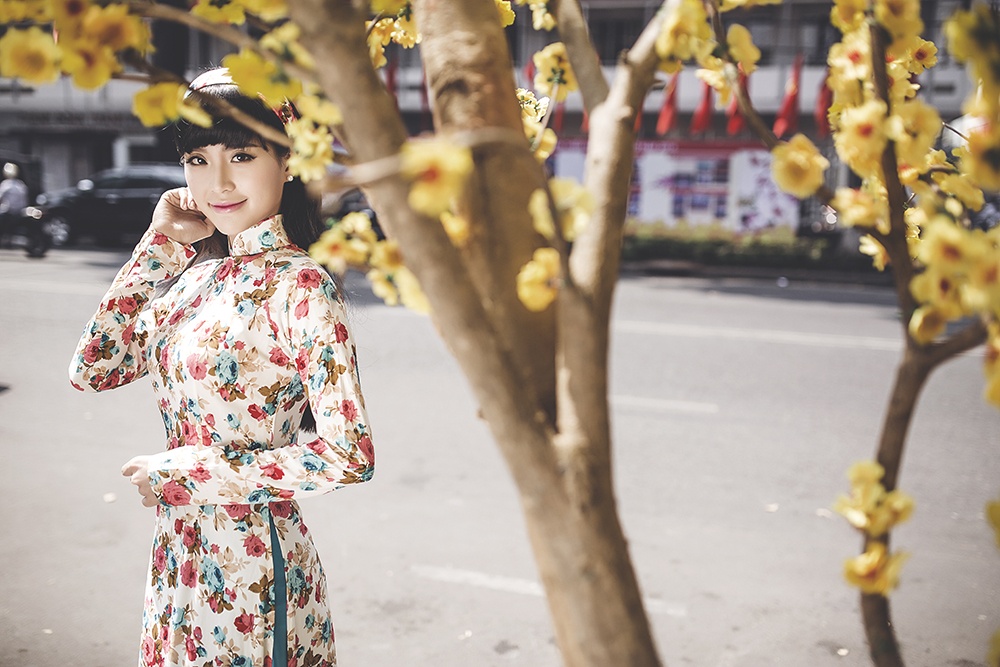 | Trong bộ ảnh chủ đề mùa xuân Ất Mùi, á hậu Diễm Trang chọn trang phục họa tiết in hoa nền nã và duyên dáng, phù hợp với hình ảnh thanh lịch, nhẹ nhàng mà cô hướng đến. Vốn sở hữu vóc người cân đối cùng gương mặt tươi tắn, áo dài họa tiết hoa cổ điển lại càng làm tăng sức hút của á hậu khi cô dạo phố Tết Sài thành. |