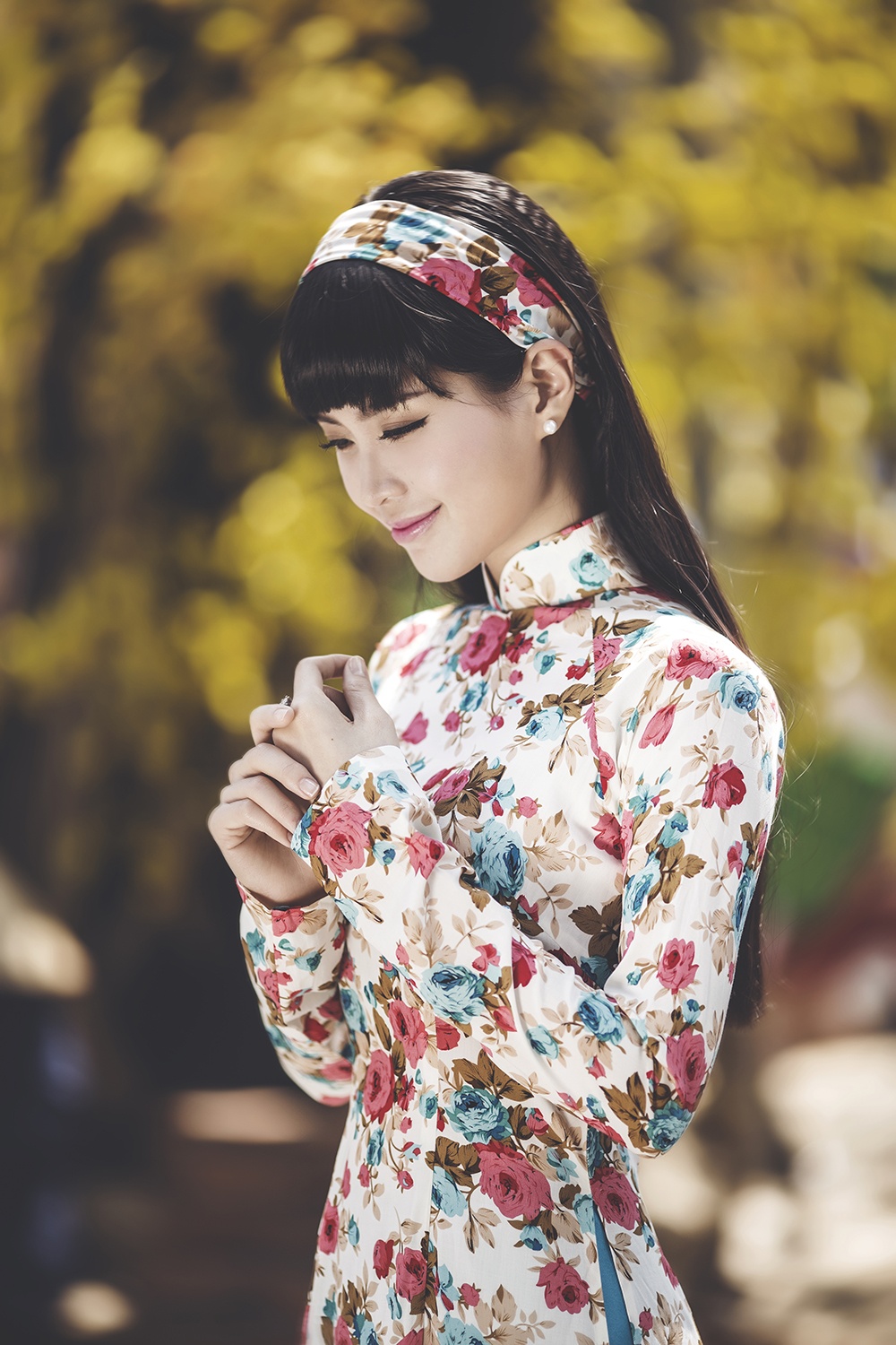 Á hậu Diễm Trang diện áo dài hoa cổ điển dạo phố xuân