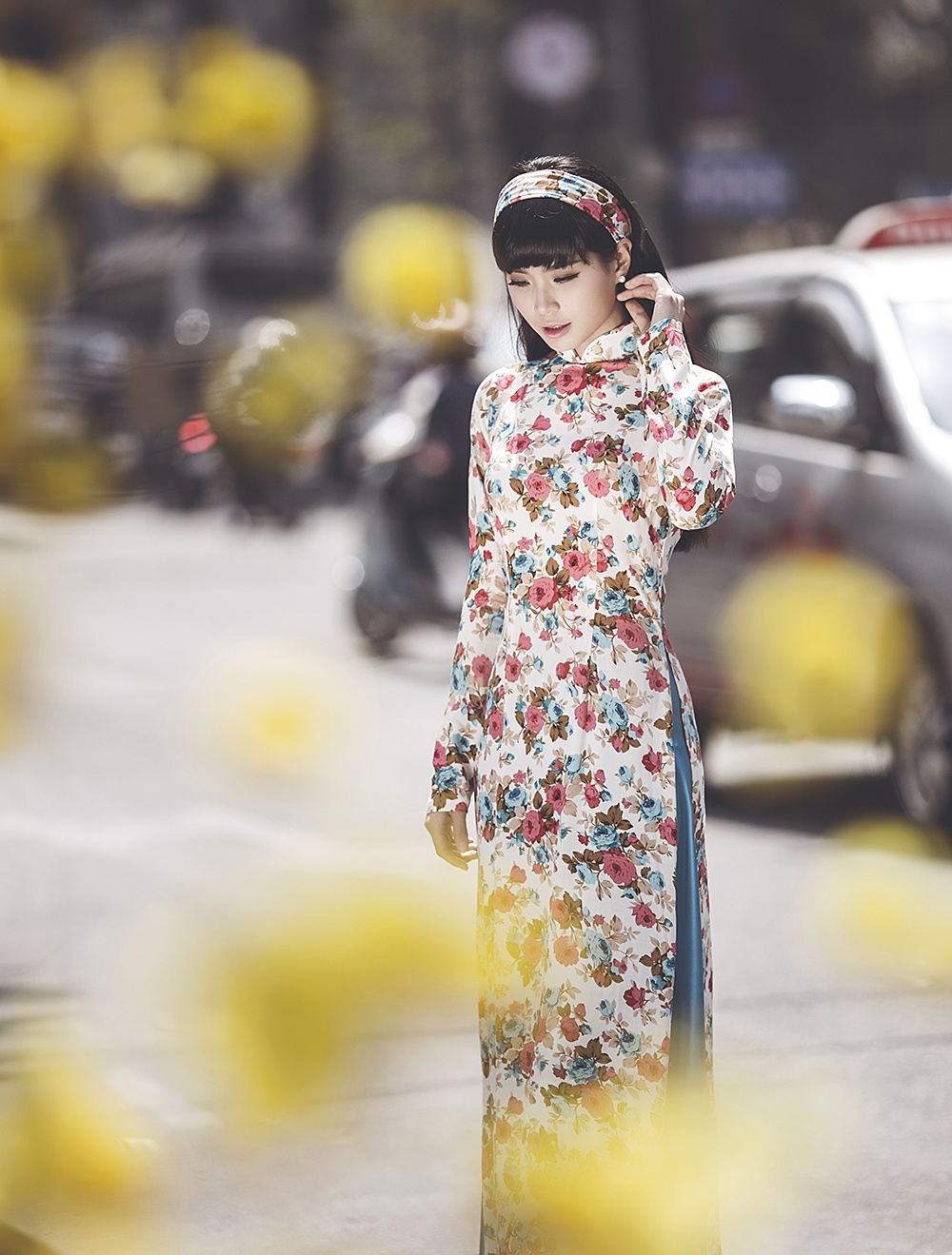 | Áo dài phong cách cổ điển, in hoa nổi bật cùng phụ kiện băng-đô đặc trưng của thời trang những năm 70 giúp á hậu nổi bật giữa phố hoa xuân khi cô dạo bước. |