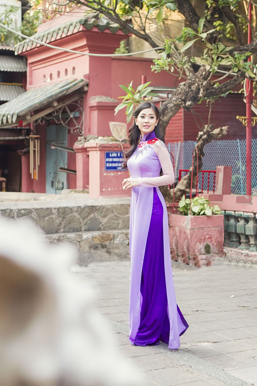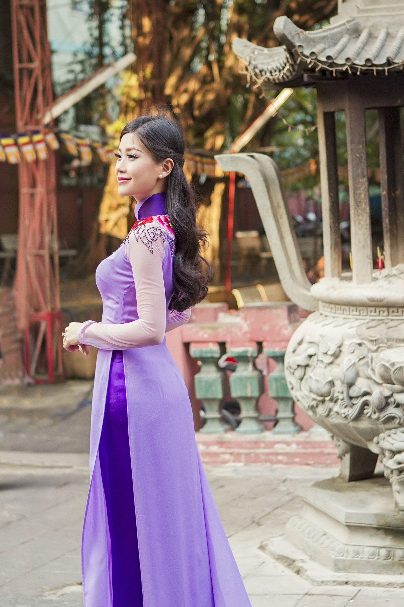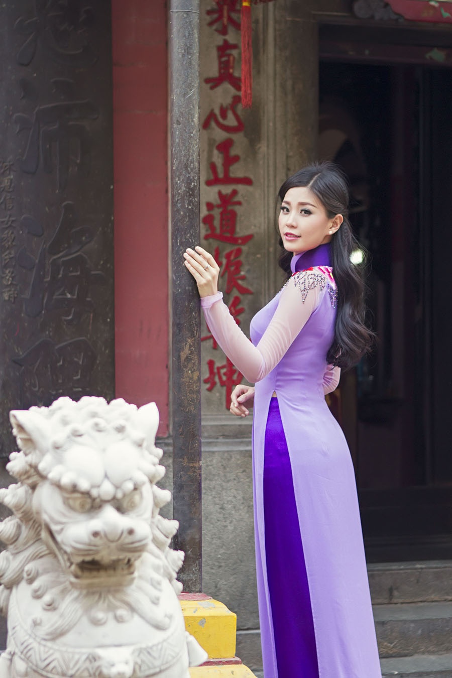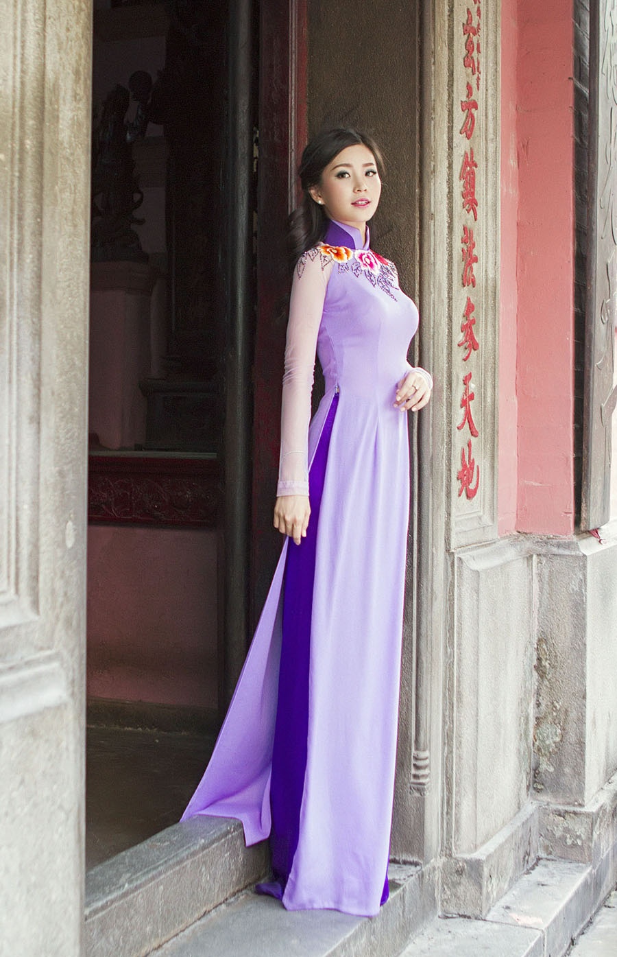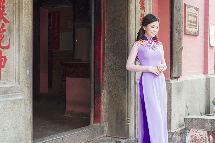 | Vẻ đẹp nữ tính của Diễm Trang thêm phần cuốn hút khi cô diện áo dài tông màu tím pastel. Á hậu trông nhẹ nhàng, sâu lắng, làm sống động không gian tĩnh lặng. |