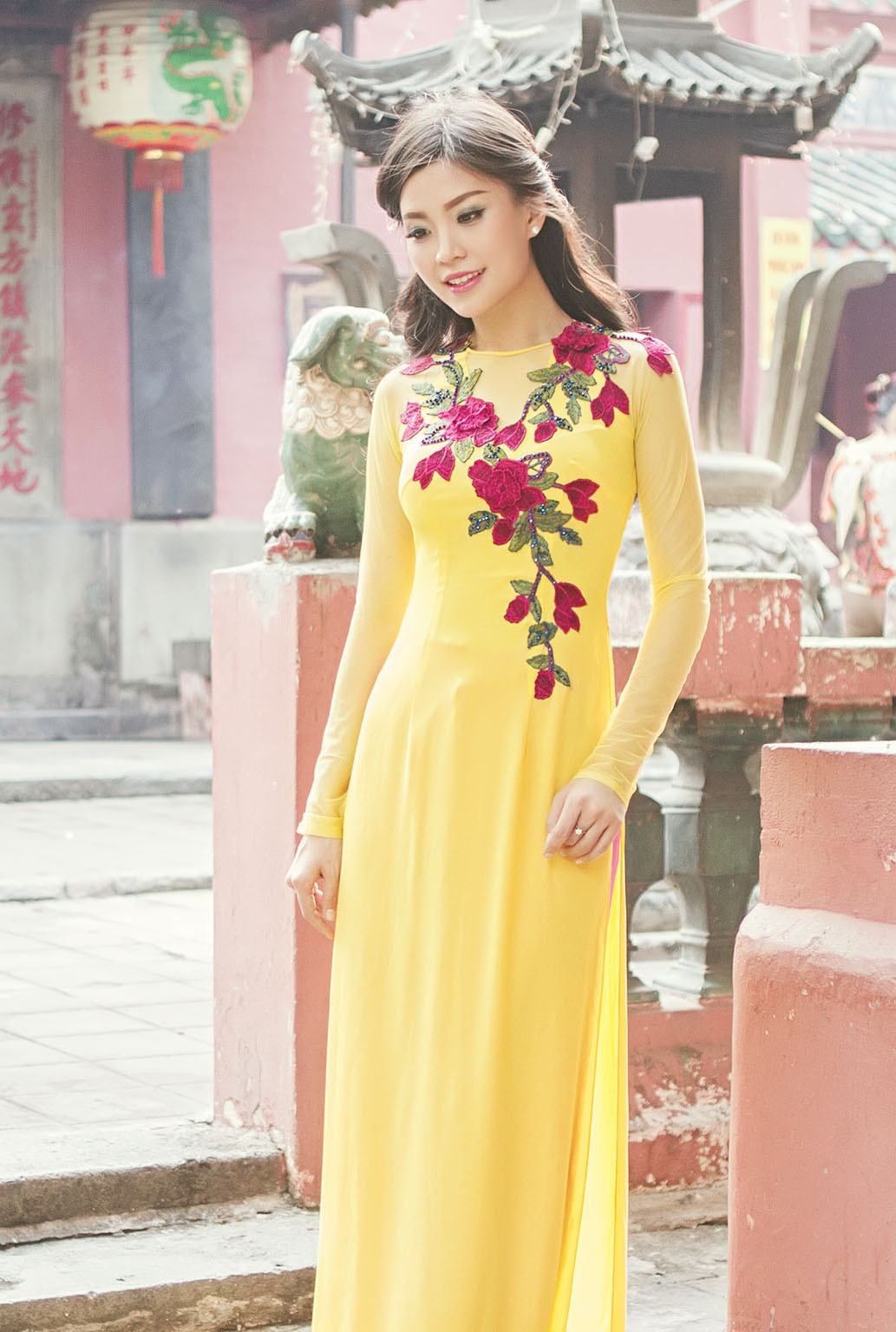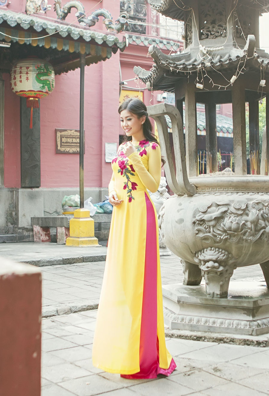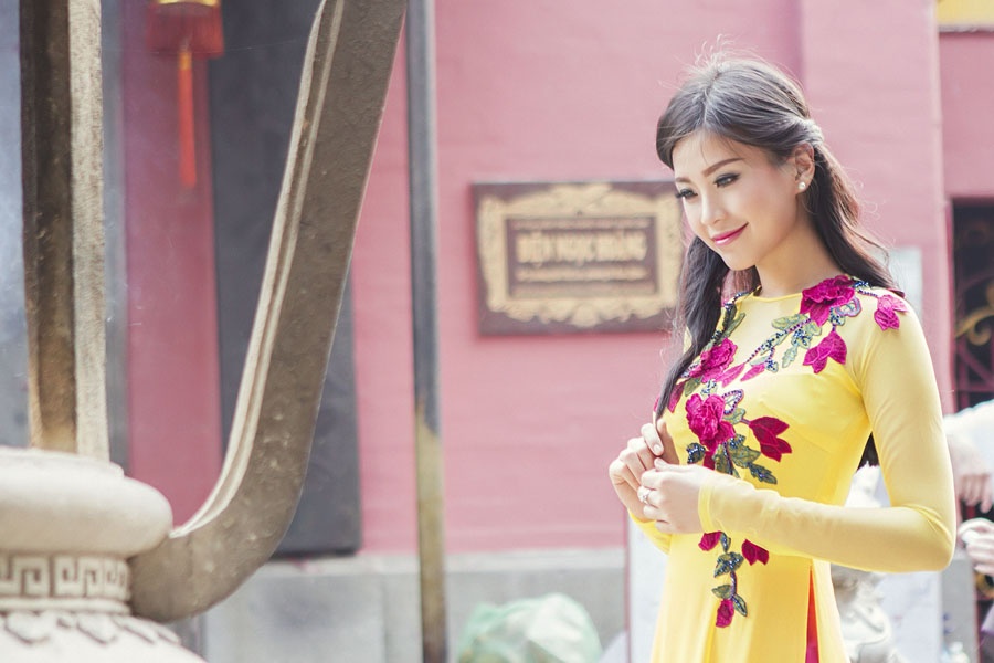 | Trong mỗi khung hình, Á hậu Việt Nam 2014 trông nữ tính và duyên dáng khi khoác lên mình áo dài tông màu vàng nổi bật, họa tiết hoa thêu làm điểm nhấn tinh tế. Tông màu đồng thời tôn nước da trắng và nét trẻ trung của người mặc. |