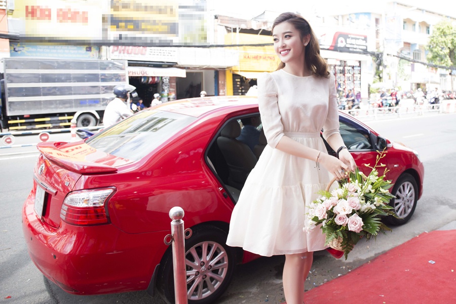 | Chiều 2/7, á hậu Huyền My đến dự tiệc khai trương một thương hiệu trên chiếc xe ô-tô màu đỏ sang trọng. Trong ảnh, cô tươi tắn bước xuống xe cùng lẵng hoa hồng pastel dành tặng cho chủ nhân buổi tiệc. |