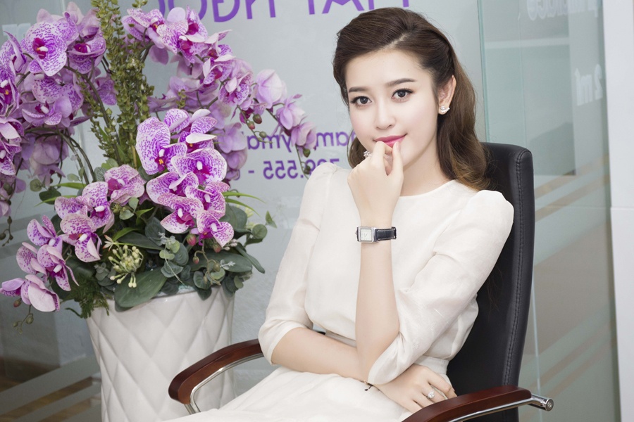 | Cùng với trang phục trắng tinh khiết, Huyền My trang điểm nhẹ nhàng với tông màu nude. Mái tóc uốn xoăn gợn sóng trang nhã. |