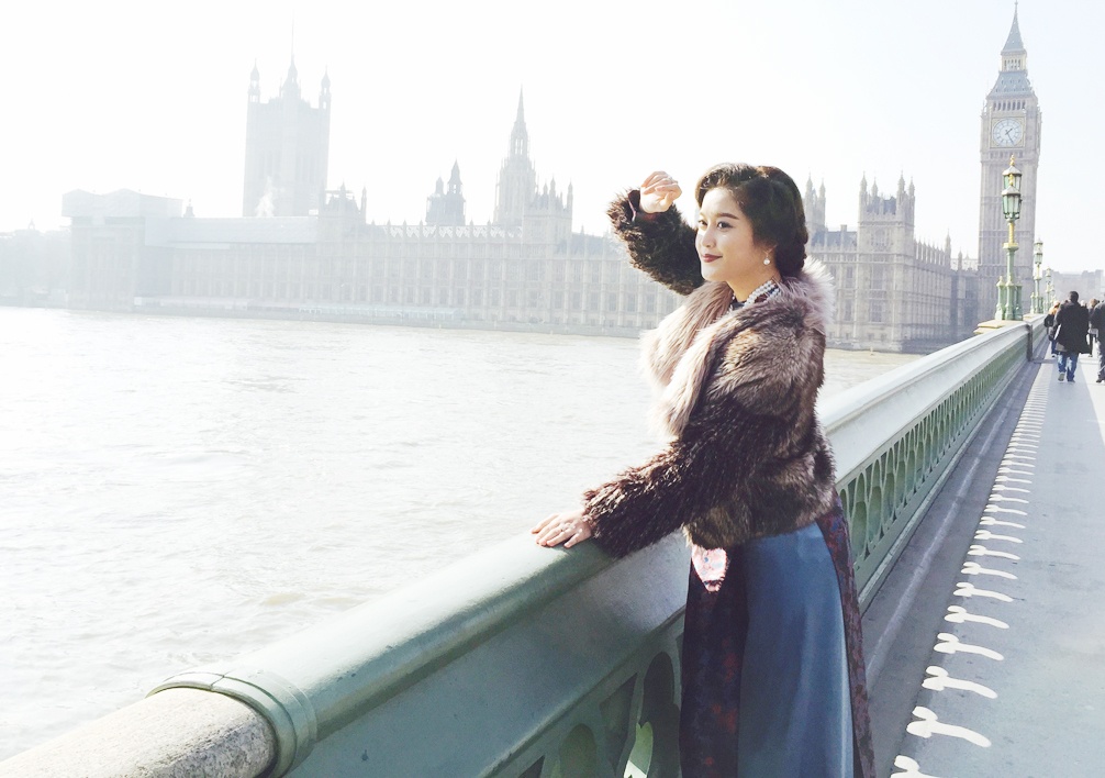 Á hậu Việt Nam 2014 diện áo dài tạo dáng bên bờ sông Thames và tháp đồng hồ Big Ben nổi tiếng.