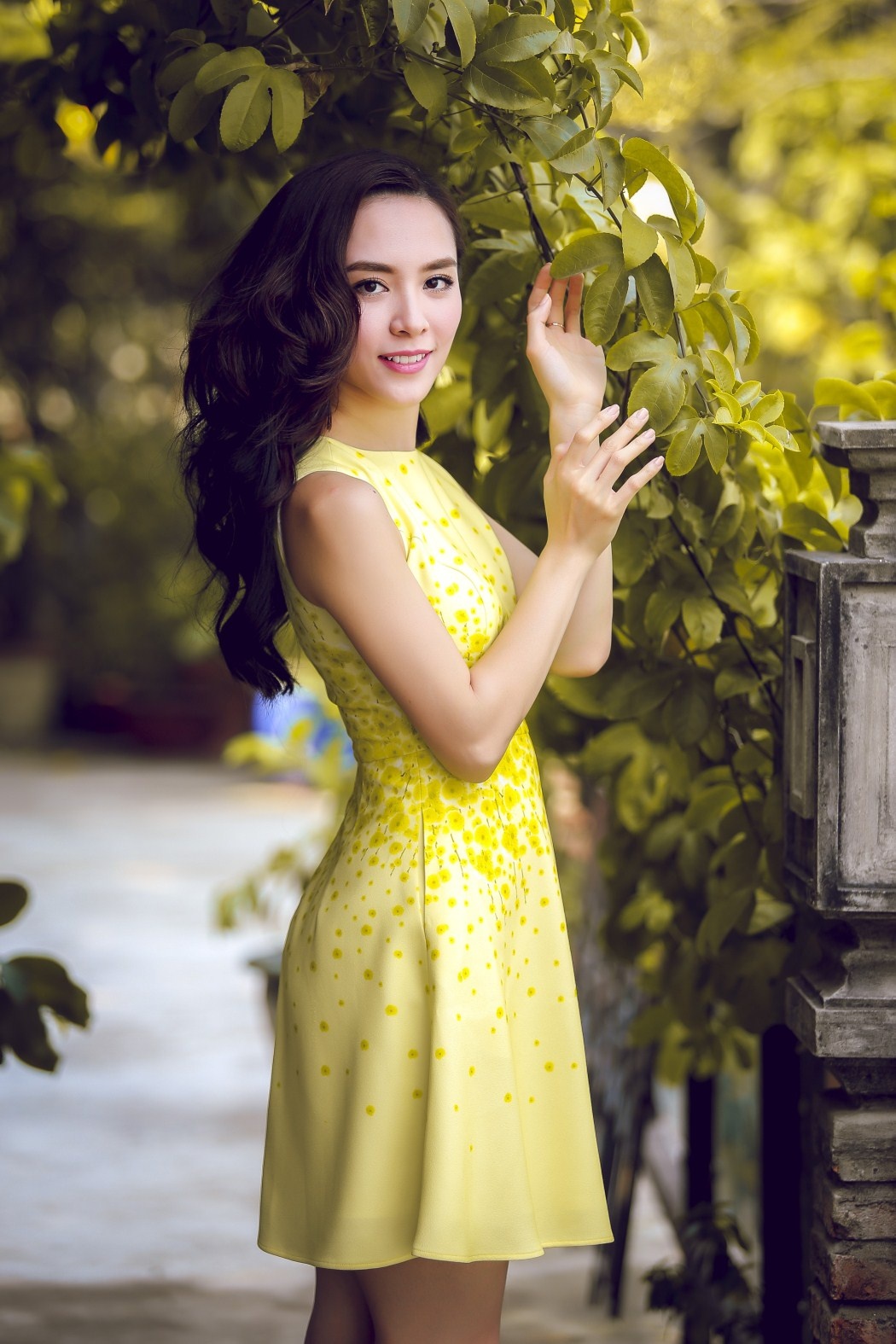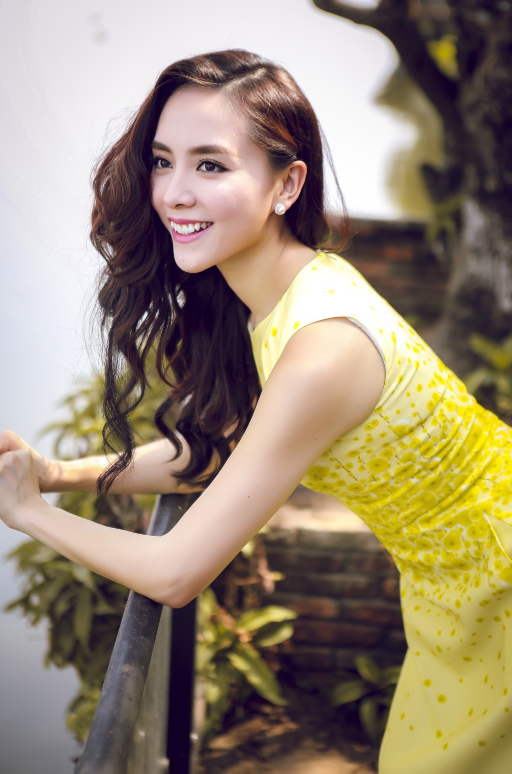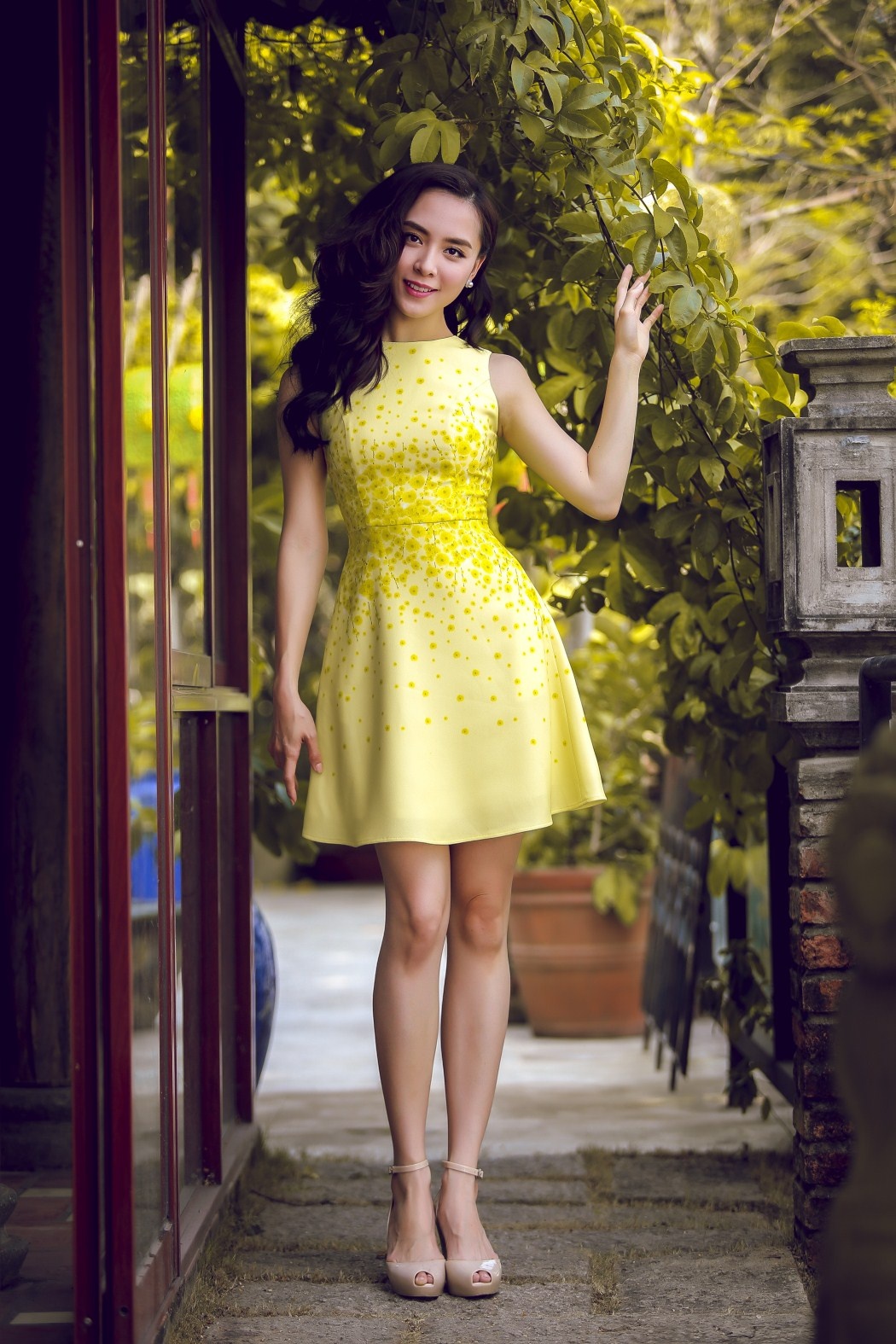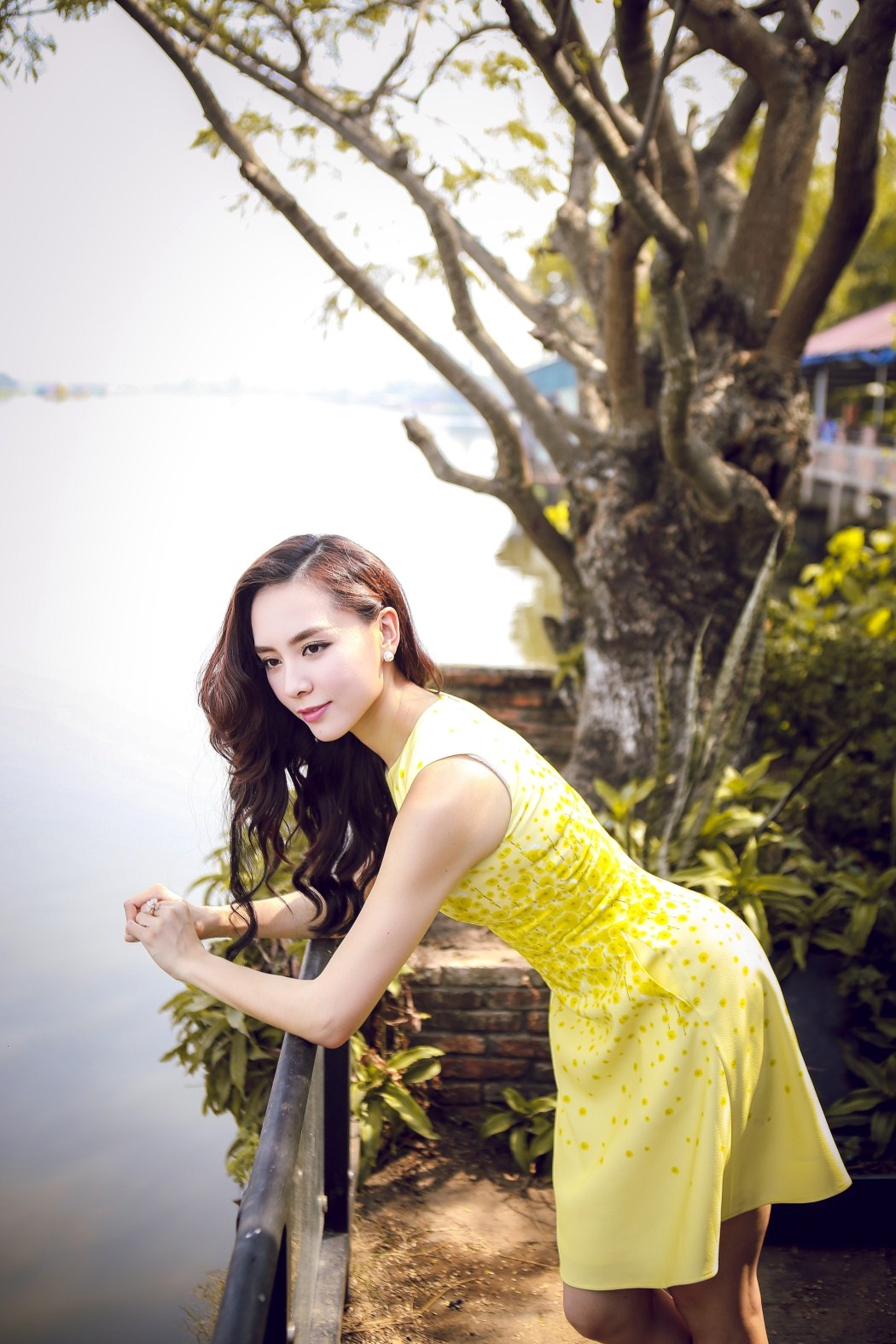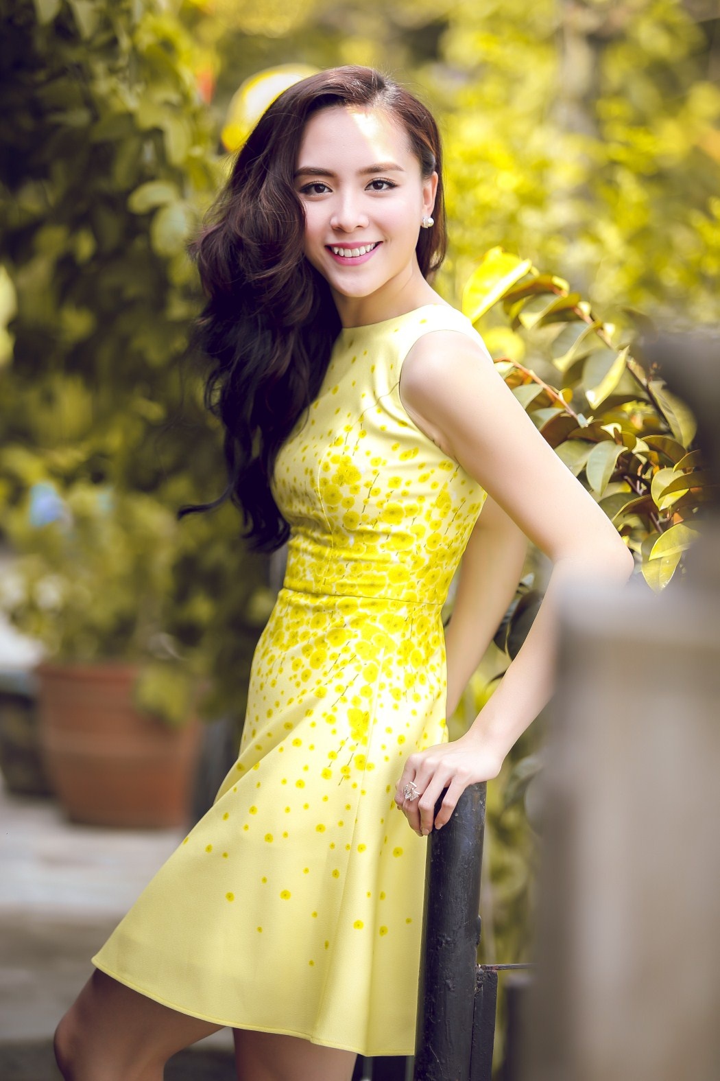 | Trang phục tông màu vàng nổi bật cùng họa tiết hoa anh đào - đang là xu hướng mùa xuân 2015 - tôn vóc dáng chuẩn của á hậu. Dù hơn một năm không tham gia chụp ảnh thời trang, bà mẹ trẻ vẫn cho thấy sức hút quyến rũ trong từng khung ảnh. Cô thể hiện tự nhiên và lôi cuốn. |
