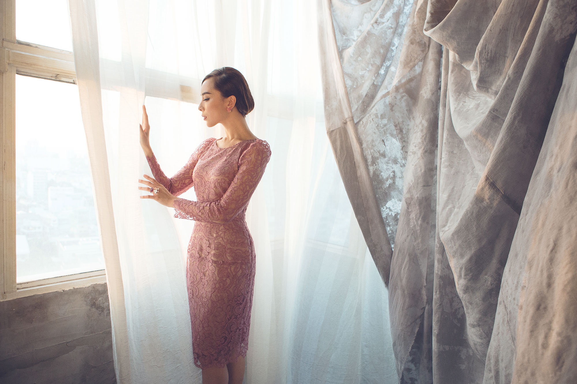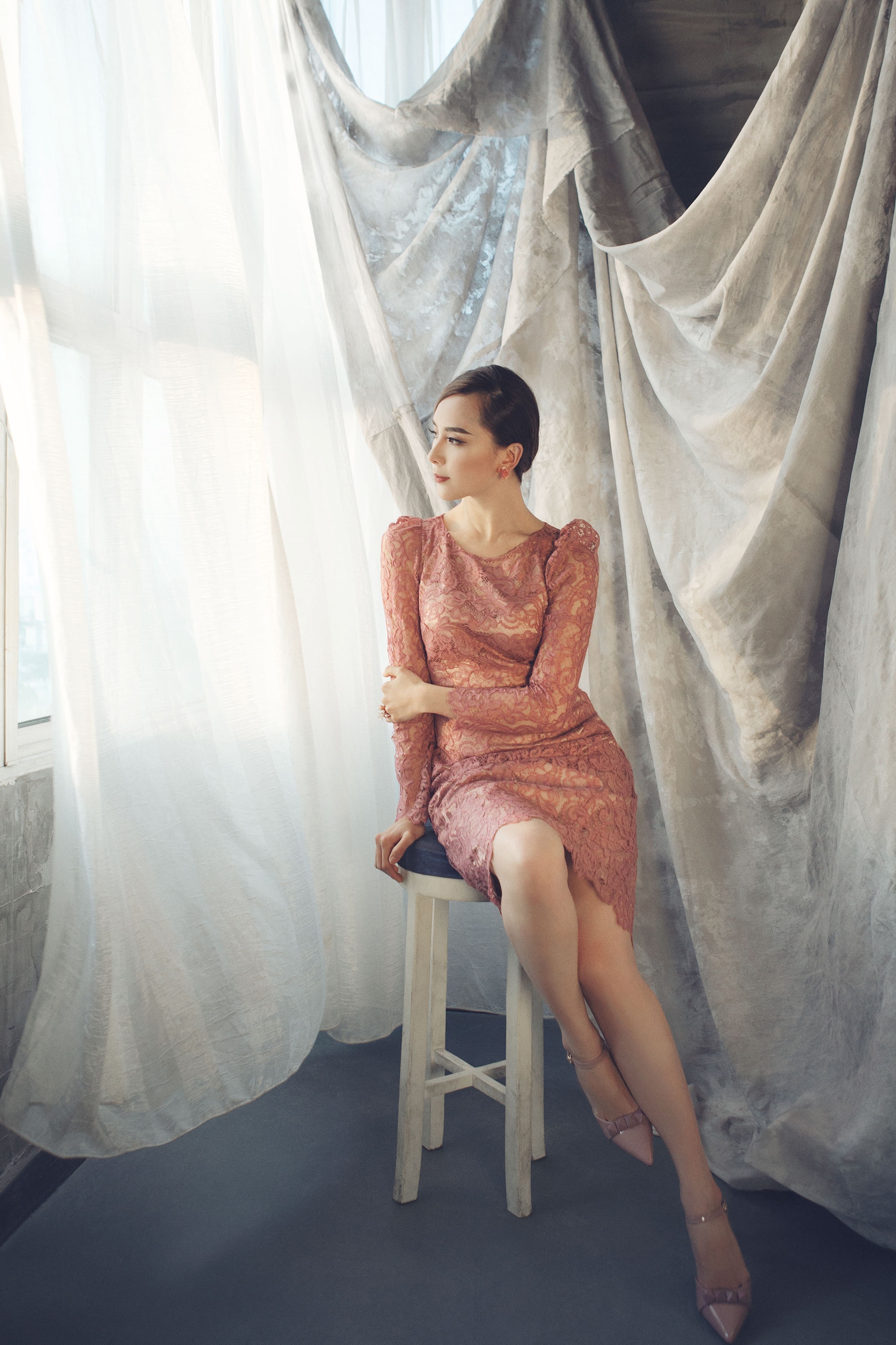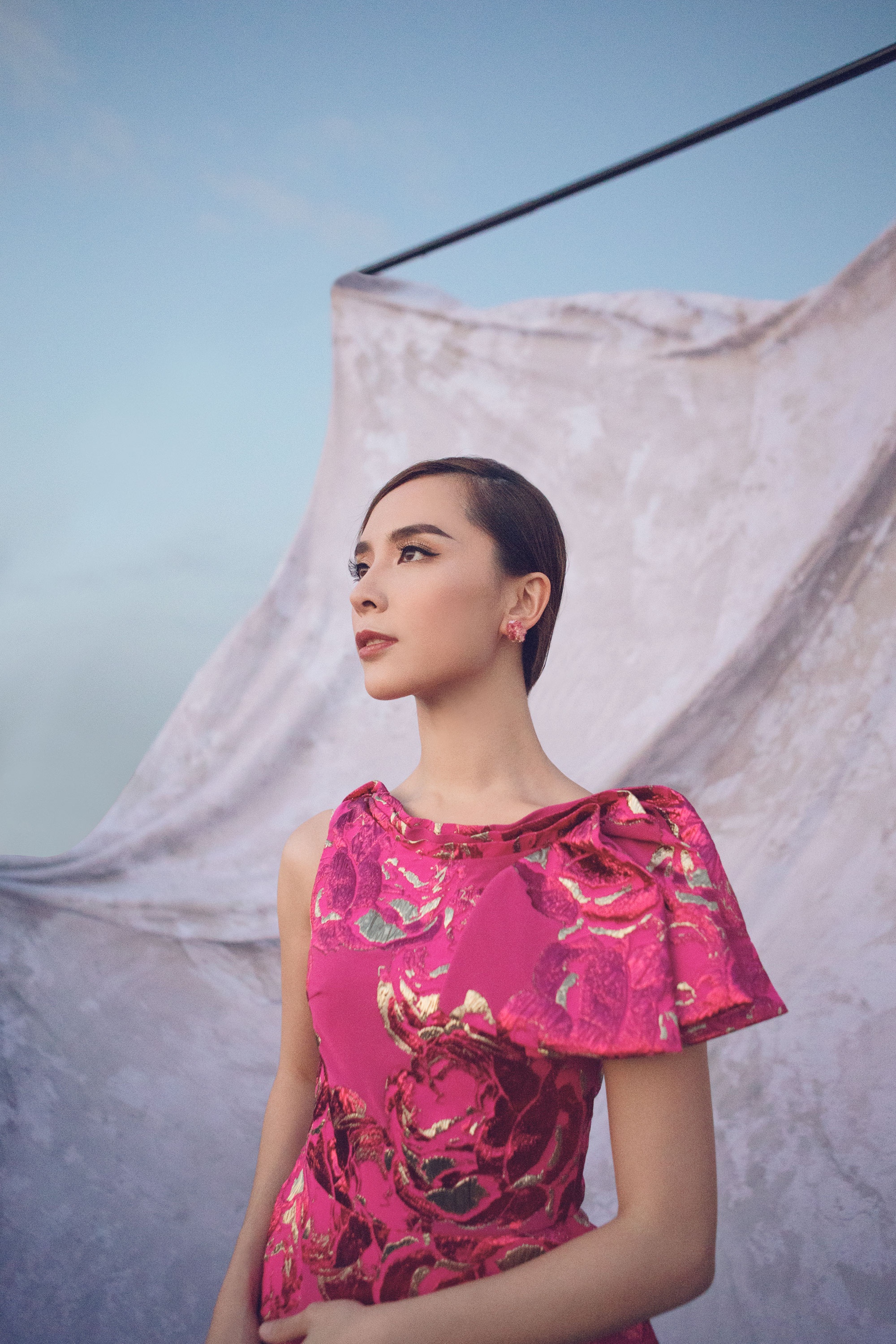 | Bộ sưu tập hướng đến vẻ đẹp thanh lịch với đường nét kín đáo, nhưng cũng không kém phần nổi bật với màu sắc bắt ánh nhìn. Trong ảnh, bà mẹ hai con diện đầm hồng ngọt ngào, hoạ tiết hoa ánh nhũ tinh tế và sang trọng. |