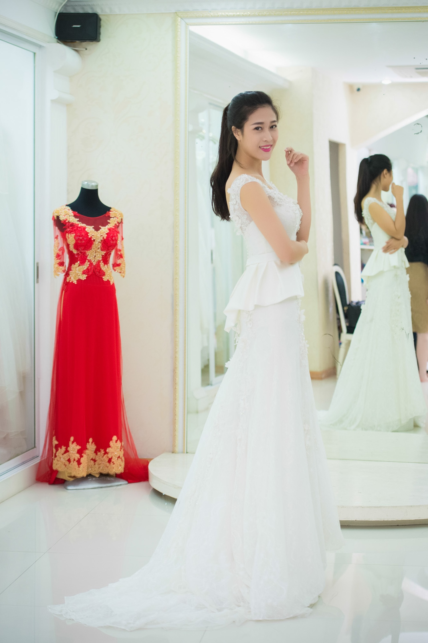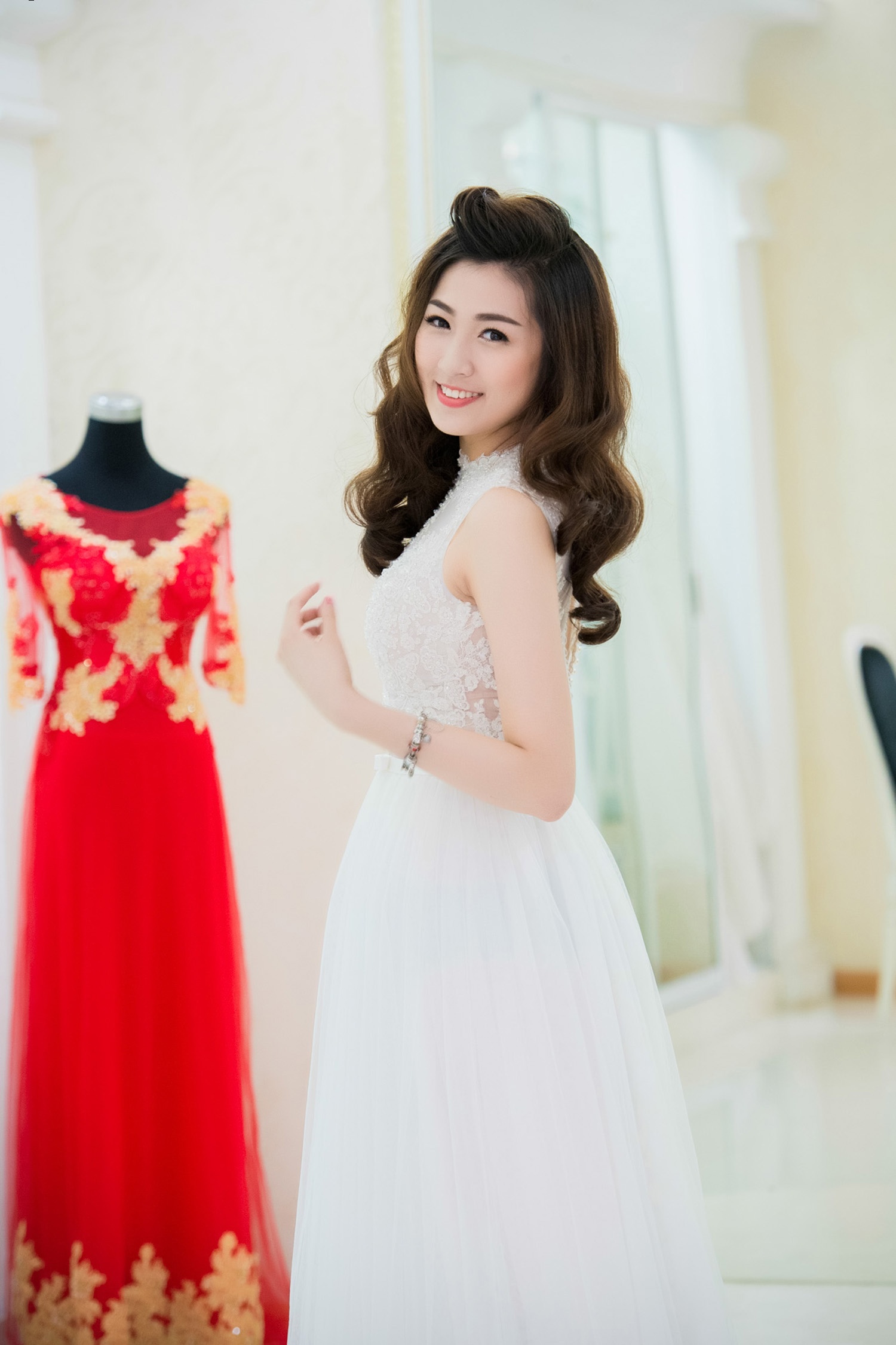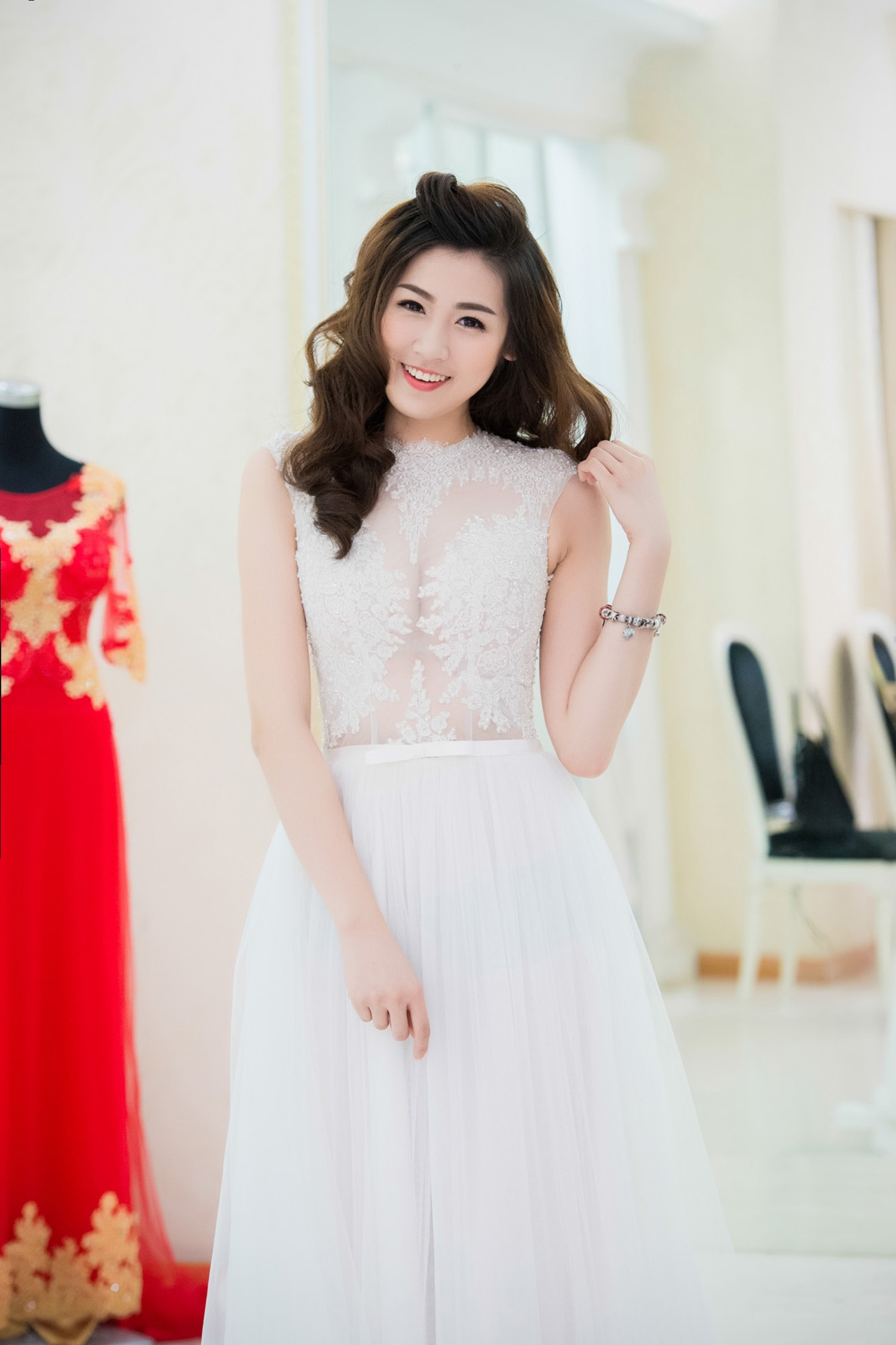 | Á hậu tự tin và rạng rỡ trong mẫu đầm cưới hợp vóc dáng. Để hợp với kiểu váy tinh khiết, trong trẻo, người dẹp trang điểm nhẹ nhàng, để tóc uốn nhẹ, cuốn hút bởi vẻ đẹp tự nhiên. |