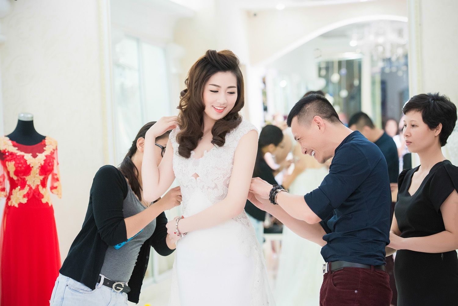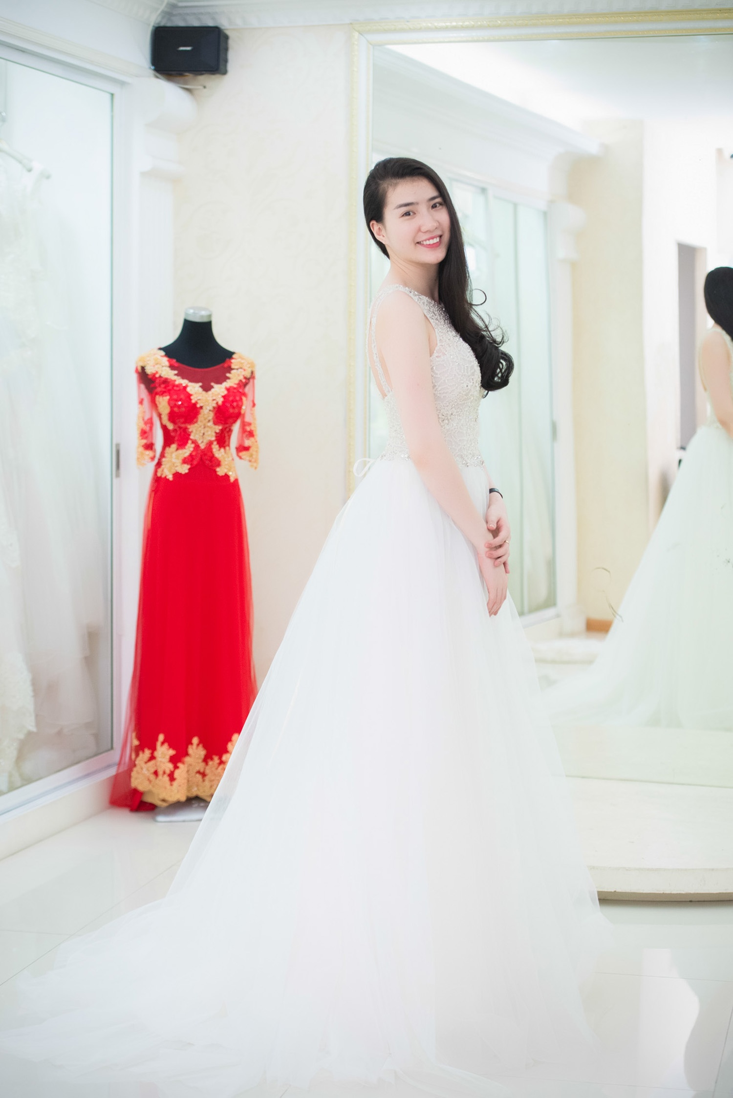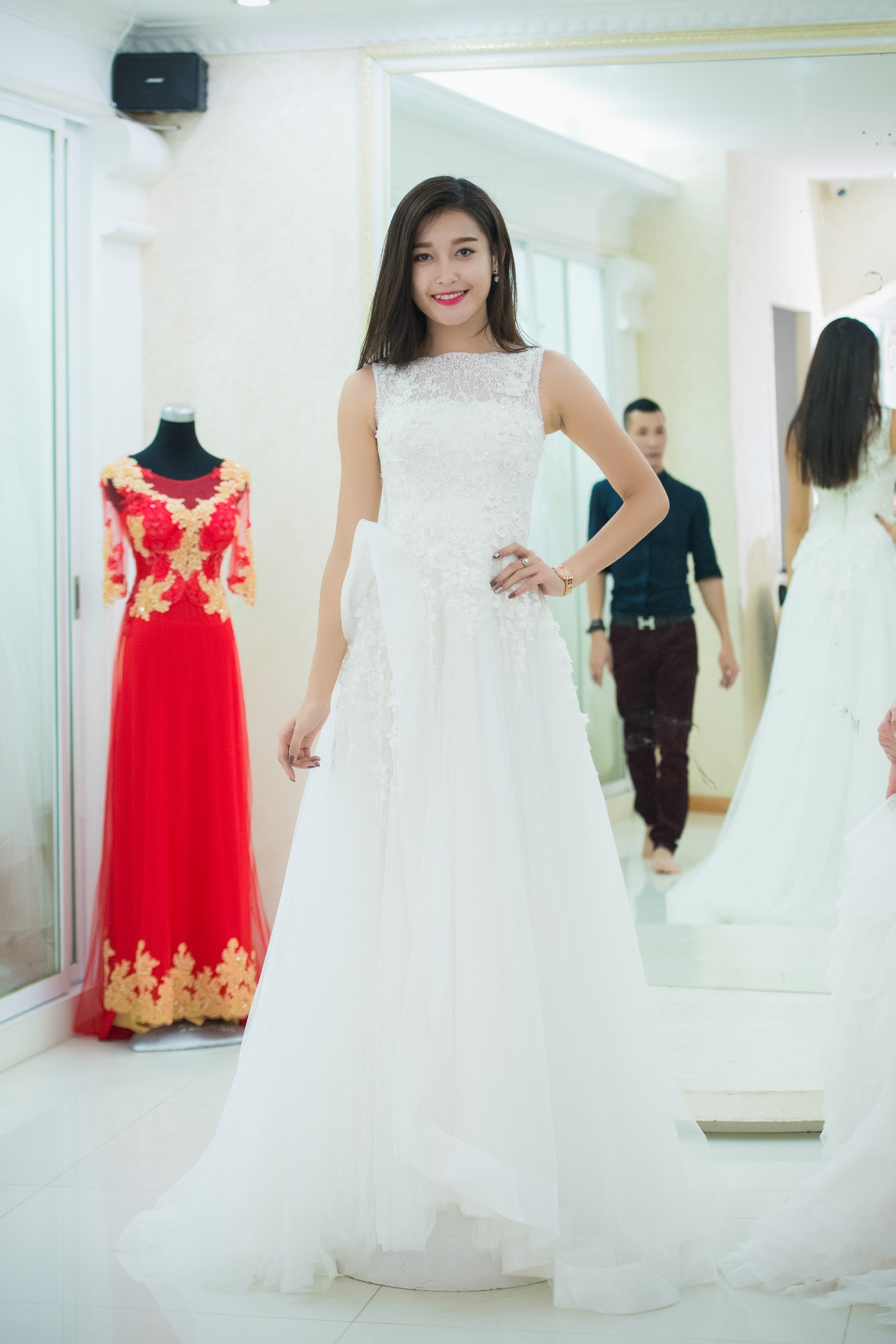 | Á hậu tự tin và rạng rỡ trong mẫu đầm cưới hợp vóc dáng. Để hợp với kiểu váy tinh khiết, trong trẻo, người dẹp trang điểm nhẹ nhàng, để tóc uốn nhẹ, cuốn hút bởi vẻ đẹp tự nhiên. |
