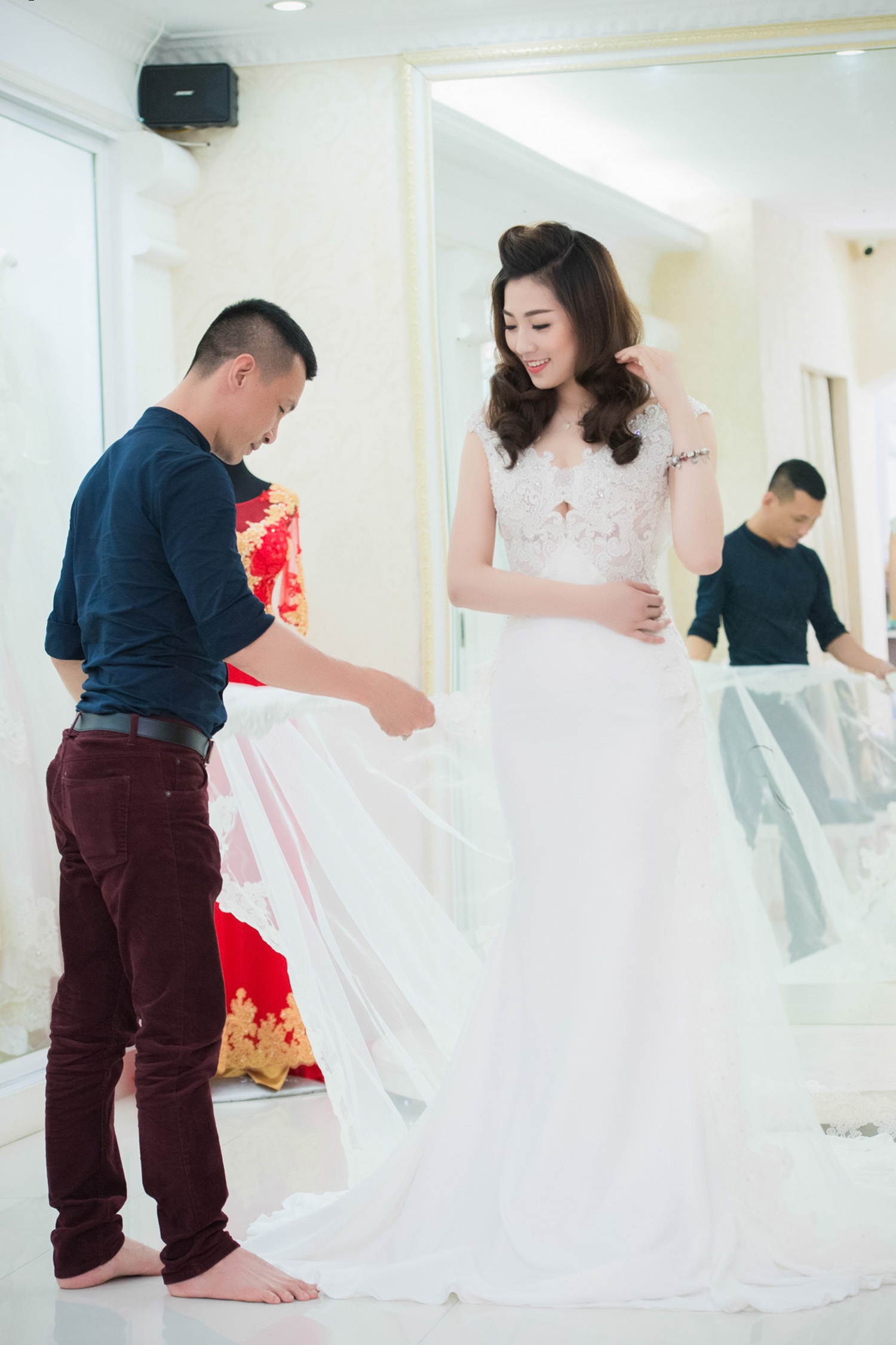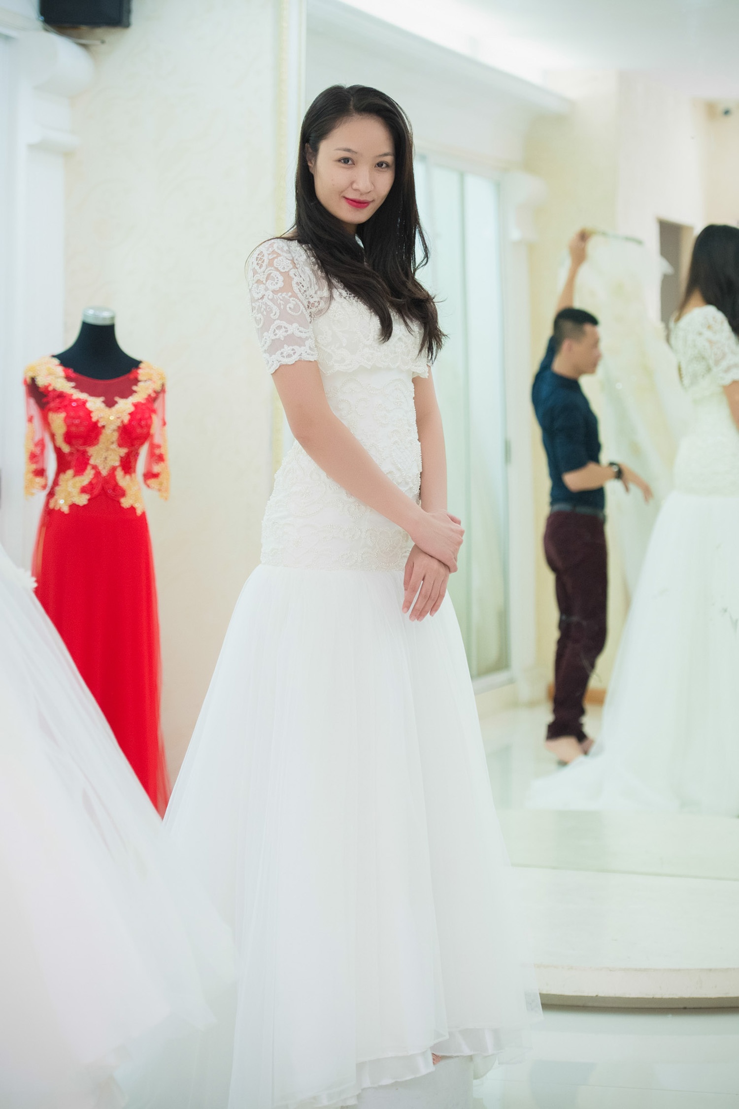 Một số chân dài miền Bắc thử trước trang phục sẽ được trình diễn tại triển lãm cưới diễn ra trong vài ngày tới.