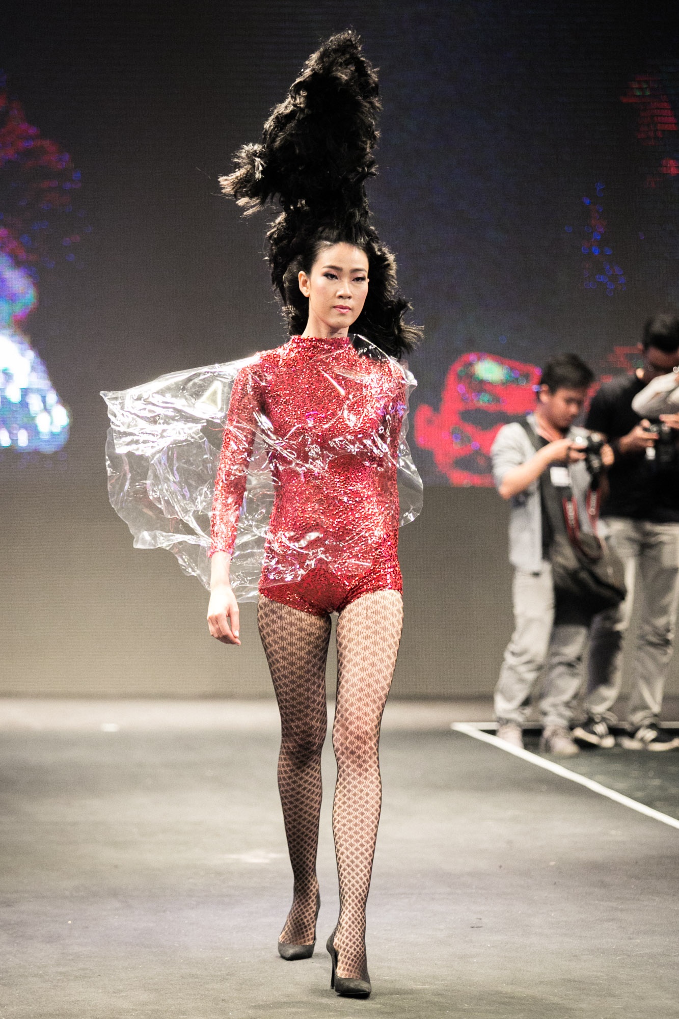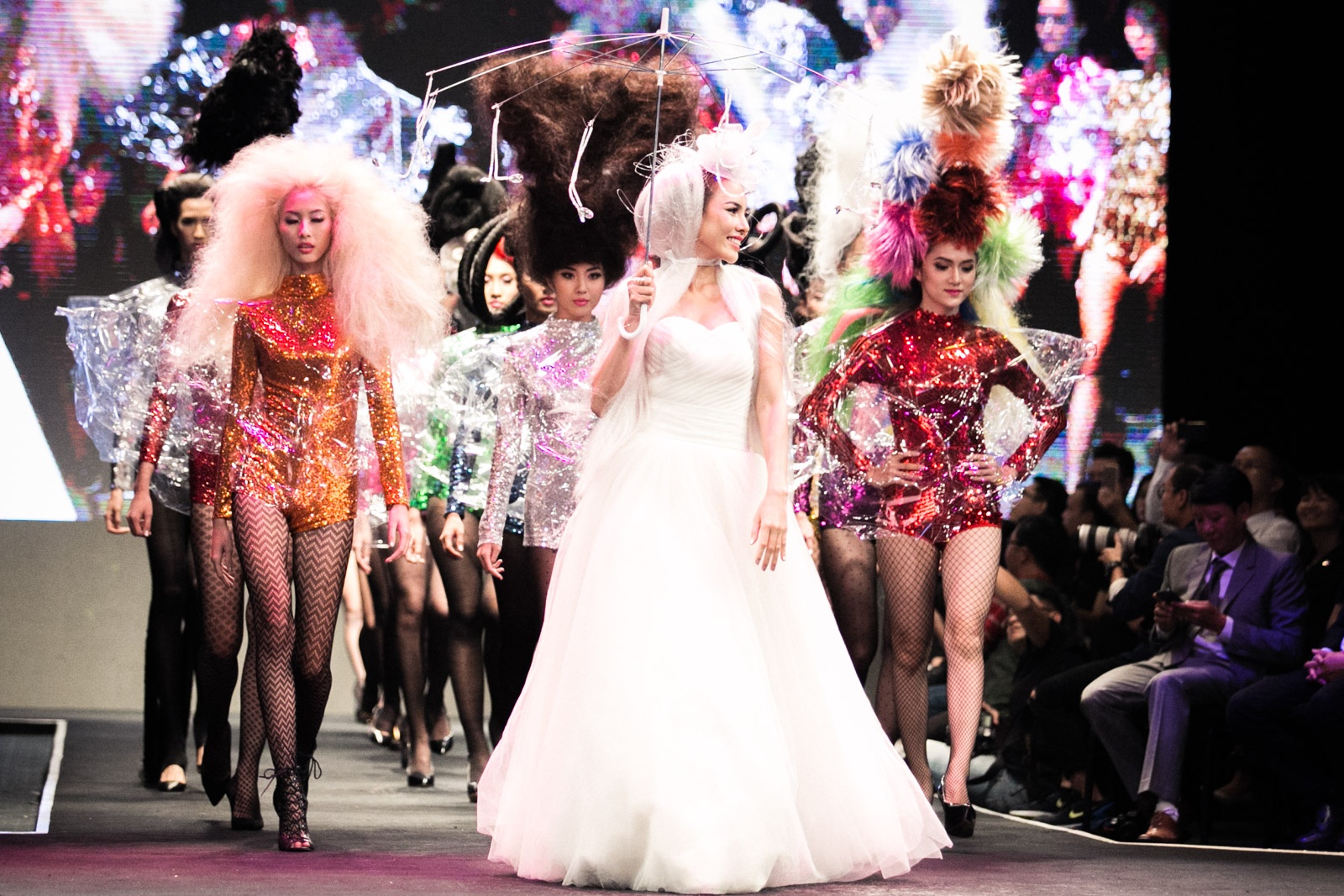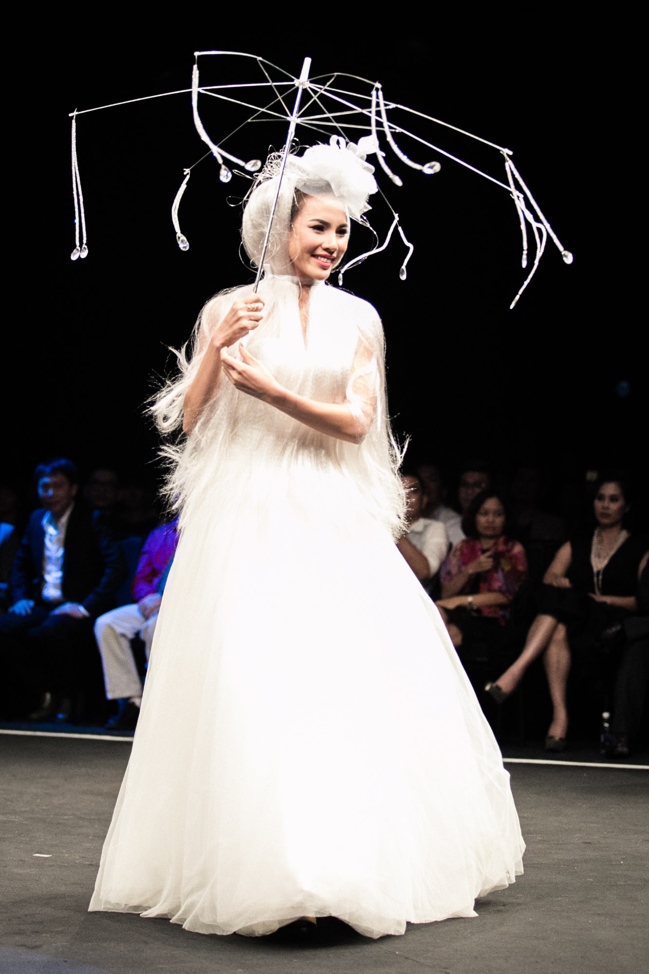 | Sau phần biến hóa với mái tóc giả bạch kim, Lệ Quyên sải bước với phụ kiện chiếc ô hỏng, nhằm tạo hiệu ứng lạ mắt cho phần catwalk. |