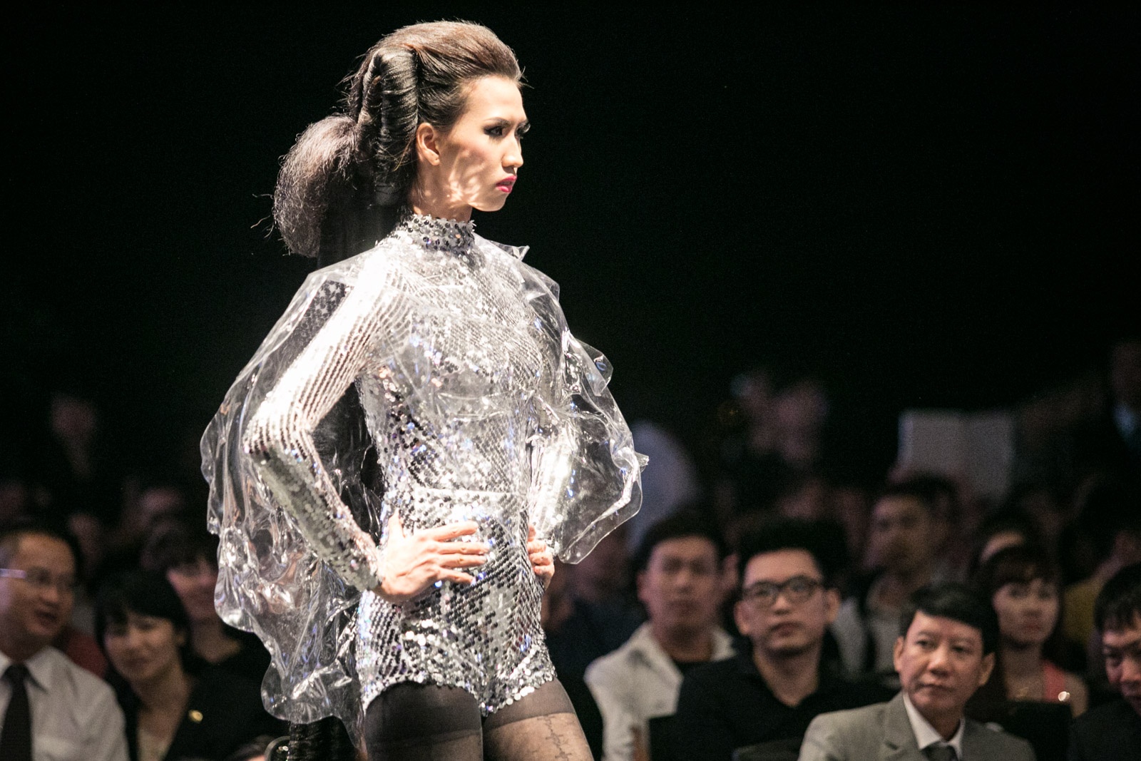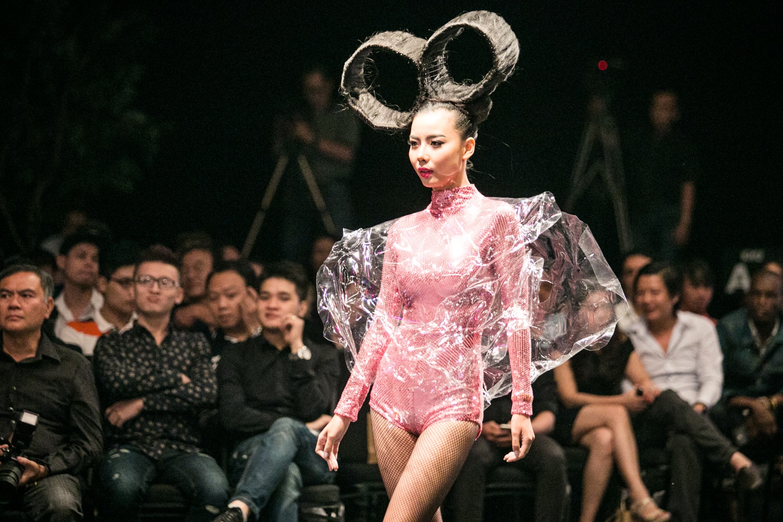 | MC Huyền Ny tham gia trình diễn một kiểu tóc ấn tượng. Bà mẹ ba con diện trang phục ánh kim do chính Don Hậu thiết kế, kết hợp là phụ kiện cầu kỳ, mang ý nghĩa về sự hoài niệm. |