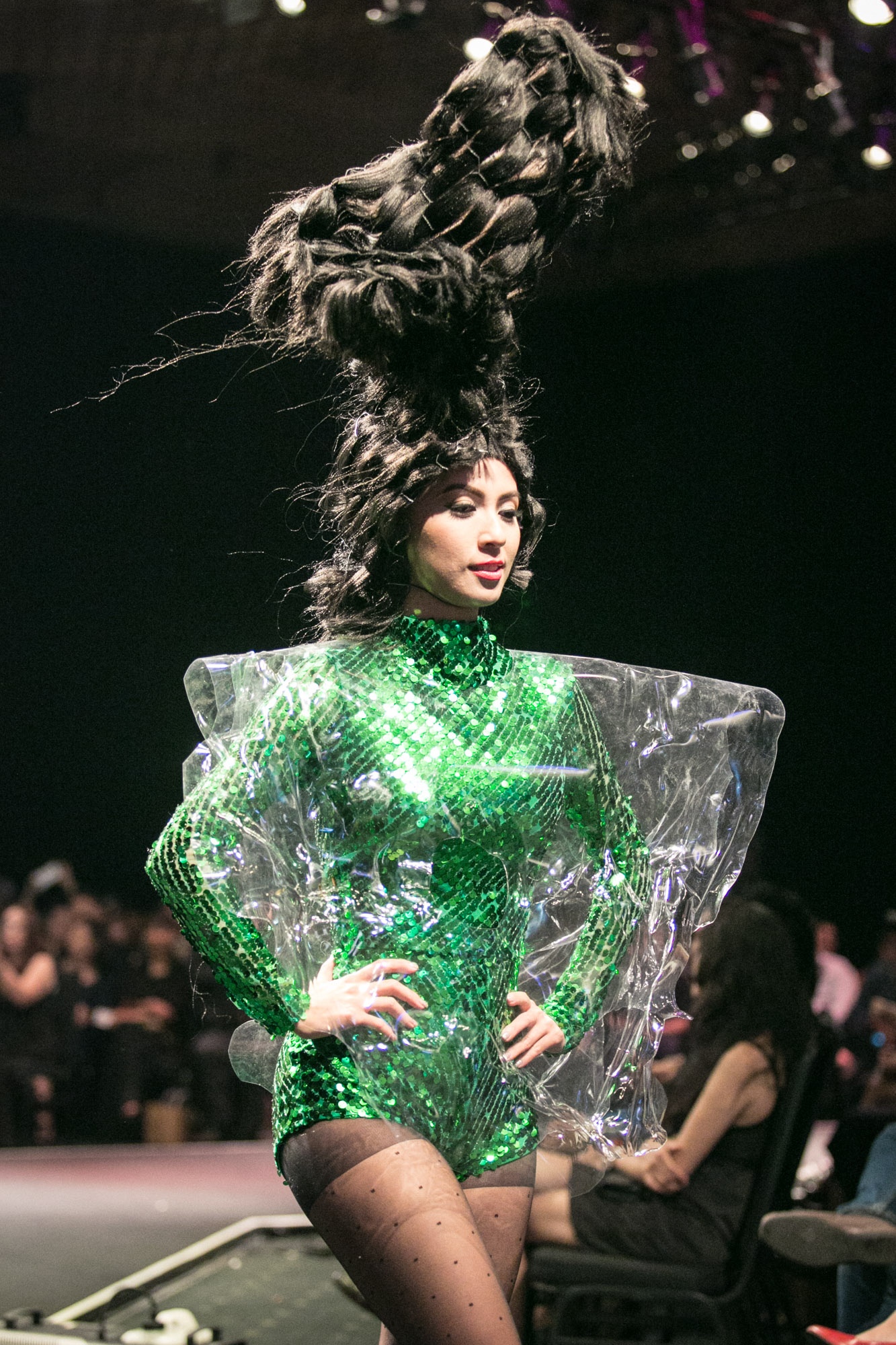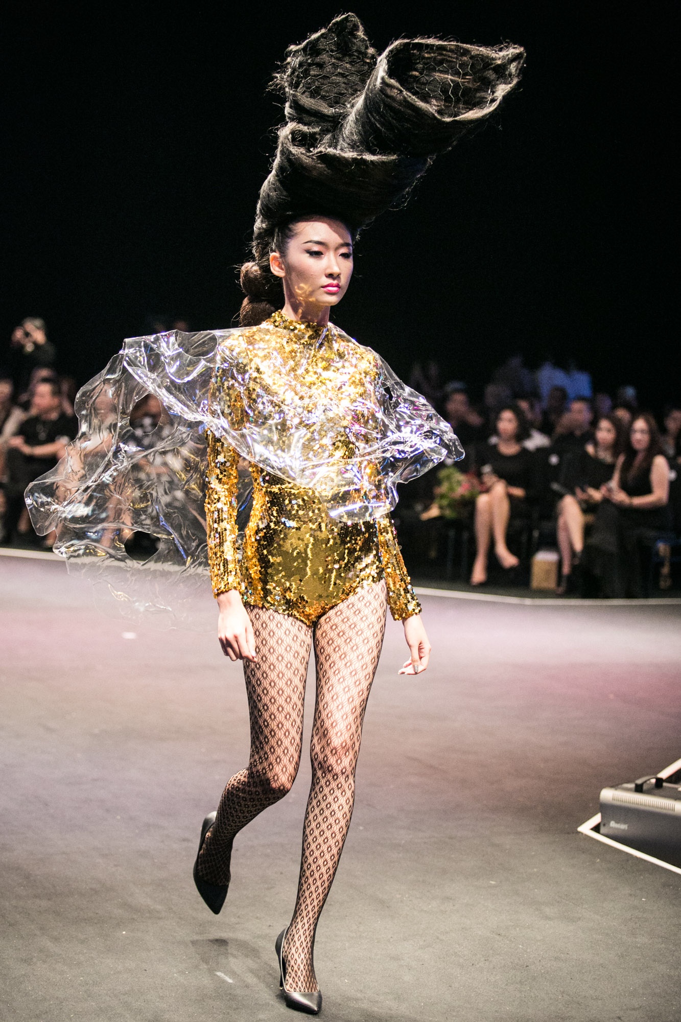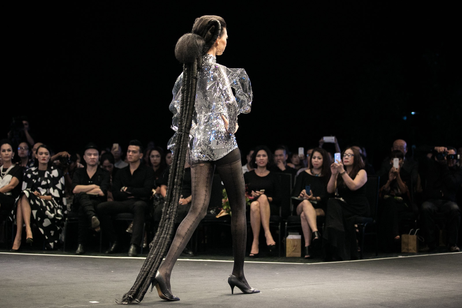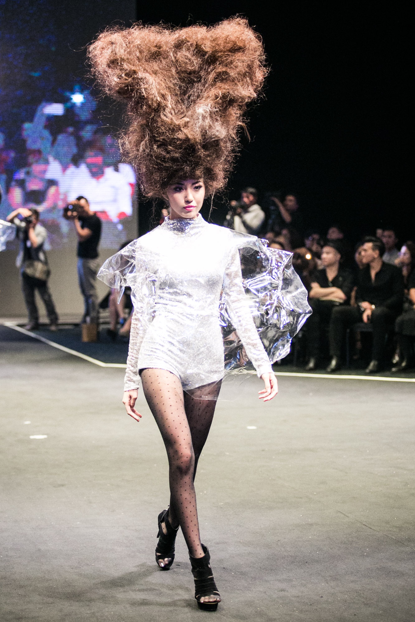 | Một số kiểu tóc nặng hơn 8 kg đã "làm khó" dàn mẫu khi sải bước. |