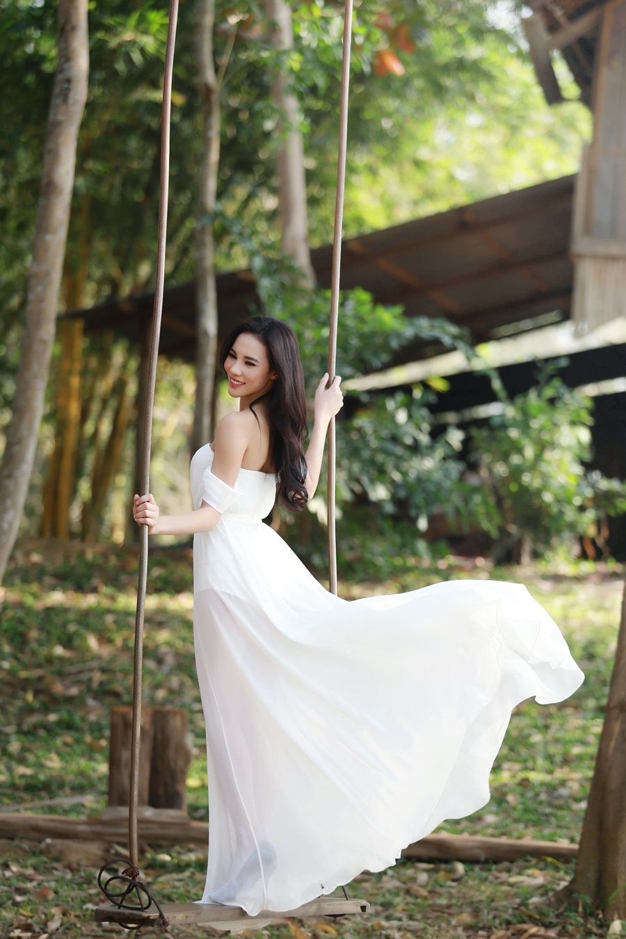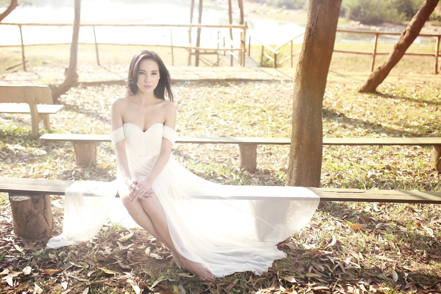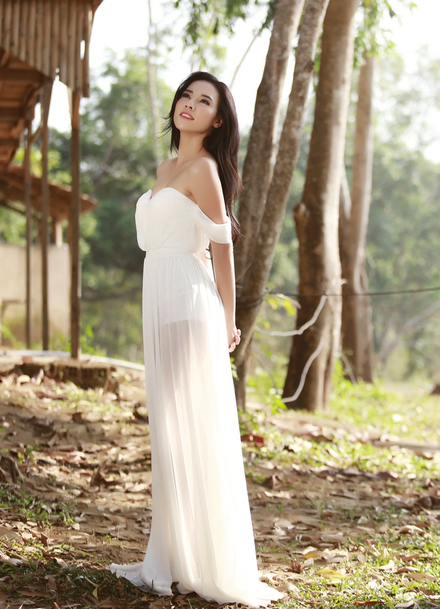 | Trang phục đầm voan trắng của Lê Thanh Hòa giúp Lệ Quyên khoe khéo bờ vai trần gợi cảm, thêm phần bay bổng giữa bối cảnh thanh bình. |