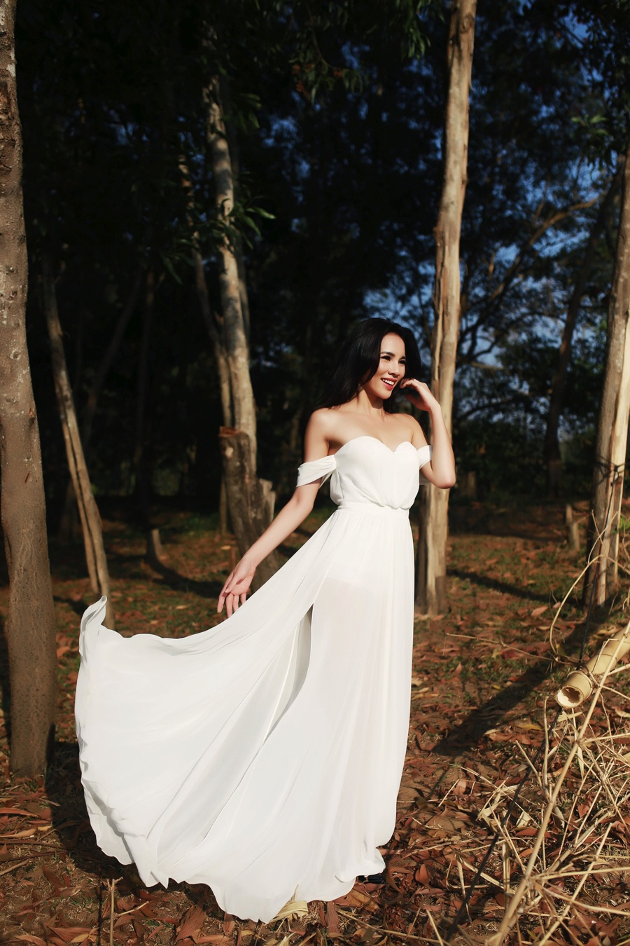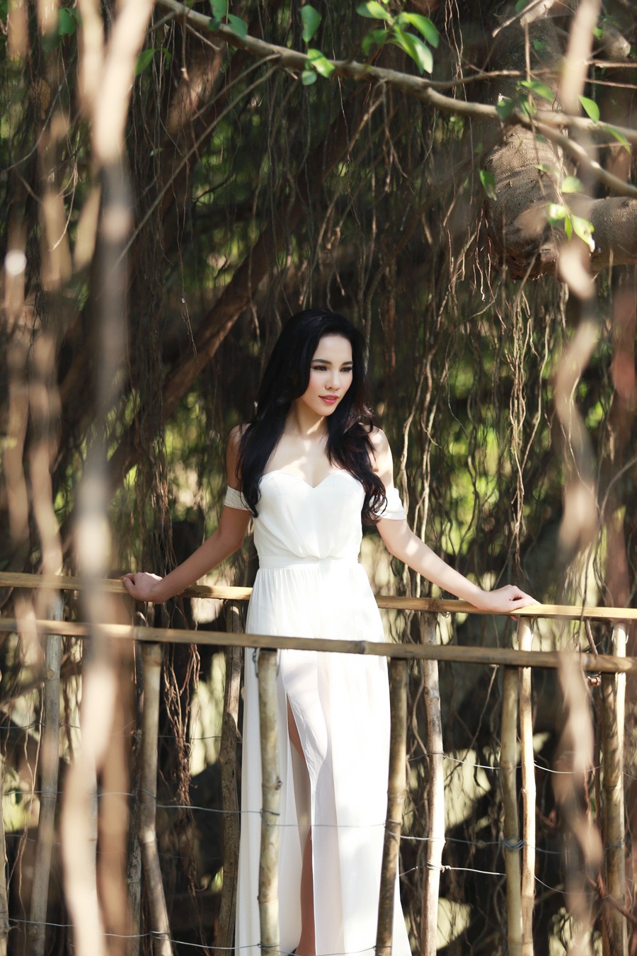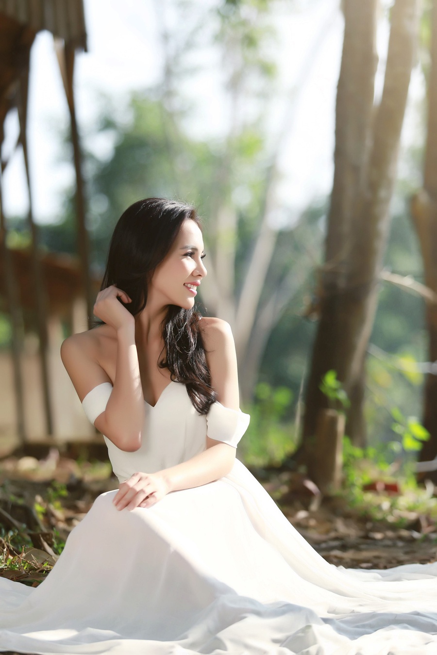 | Trang phục đầm voan trắng của Lê Thanh Hòa giúp Lệ Quyên khoe khéo bờ vai trần gợi cảm, thêm phần bay bổng giữa bối cảnh thanh bình. |