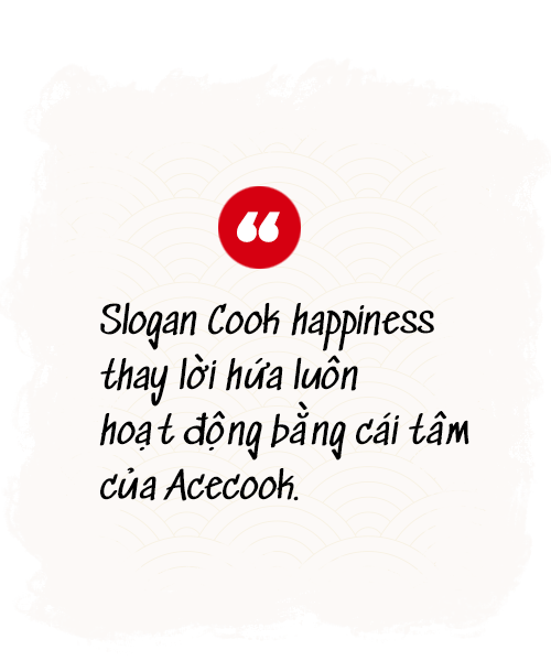 Đánh dấu 2 thập kỷ hiện diện tại Việt Nam vào năm 2015, Acecook thay đổi slogan từ “Biểu tượng của chất lượng” thành “Cook happiness”. Là doanh nghiệp thực phẩm, vì sao hãng không chọn những thông điệp đánh thẳng vào vị giác như “Thơm ngon từng sợi” hay “Vị ngon của mọi nhà”, mà lại là “Cook happiness - Nấu ra hạnh phúc”?