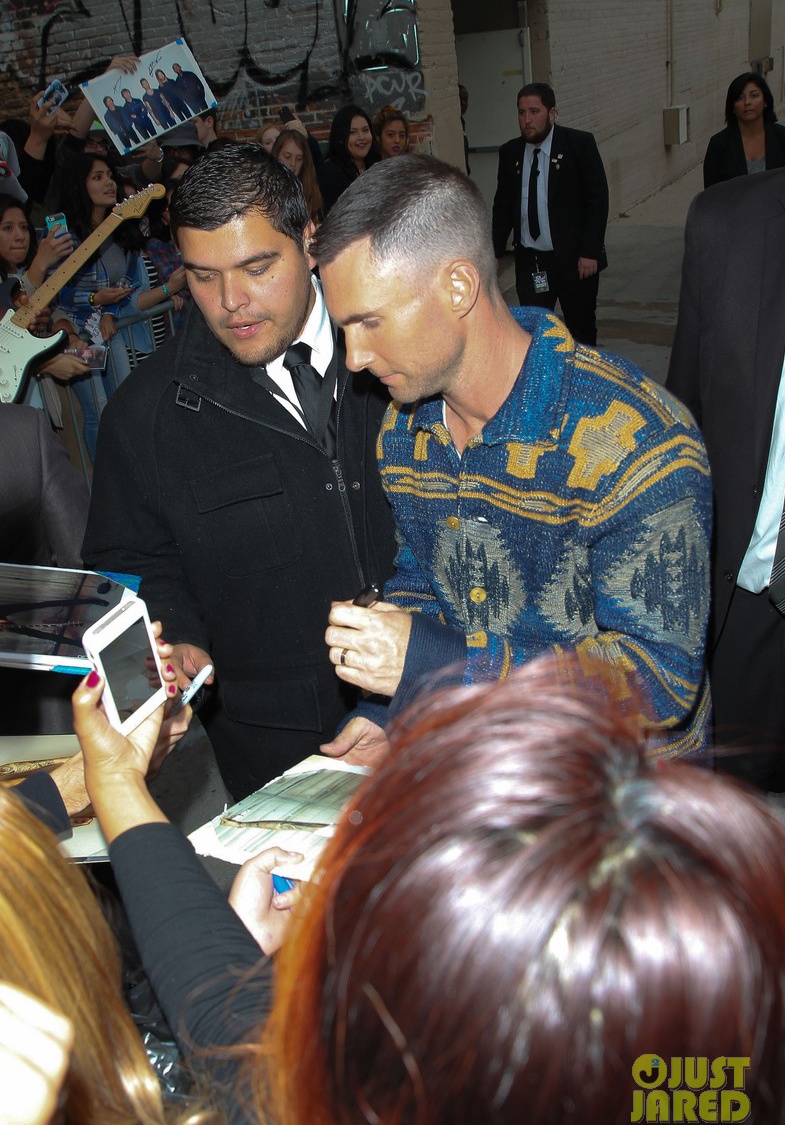 | Tối 6/5, Adam Levine tham dự chương trình Jimmy Kimmel Live. Khi đến địa điểm ghi hình, Adam Levine nhận được sự chào đón của hàng trăm fan với đủ băng rôn, biểu ngữ. |