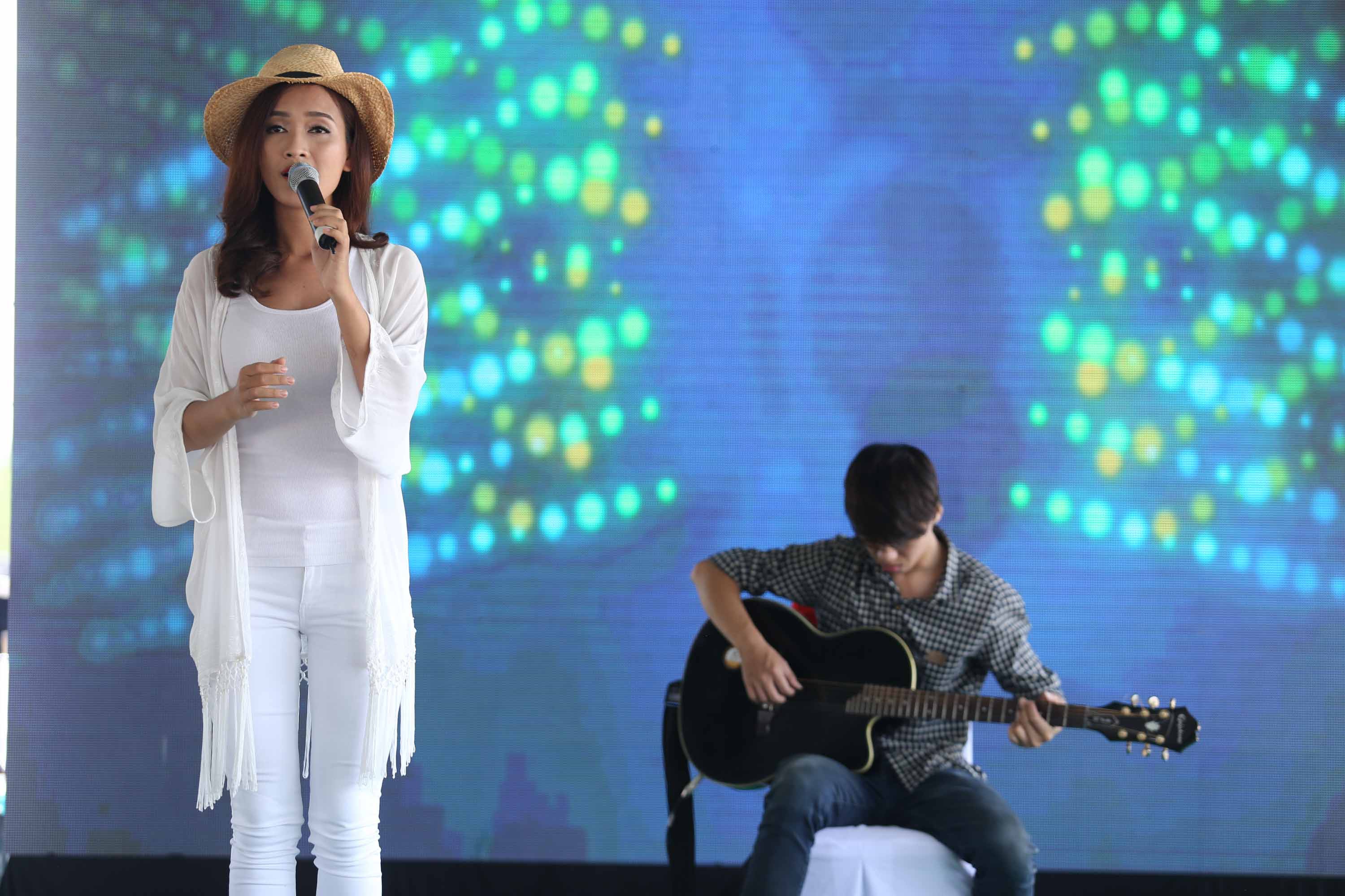 | Ái Phương nhận được nhiều sự cổ vũ của khán giả khi thể hiện giọng hát truyền cảm cùng tiếng đàn guitar. |