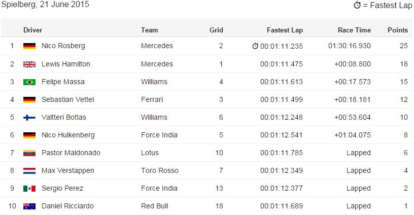| Kết quả 10 tay đua giành điểm tại chặng Austrian GP. |