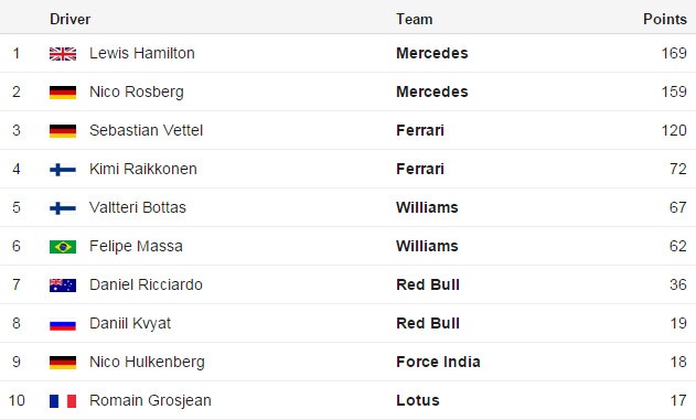 | Chiến thắng tại chặng đua nước Áo giúp Rosberg thu hẹp khoảng cách trên bảng xếp hạng tổng với Hamilton xuống còn 10 điểm. |