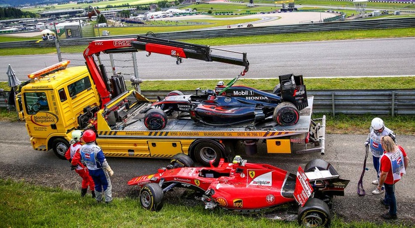 | Không lâu sau khi rời vạch xuất phát, hai chiếc xe của Fernando Alonso (McLaren) và đồng đội cũ Kimi Raikkonen (Ferrari) va chạm mạnh tại góc cua thứ 2. Do mất lái, cả chiếc MP4-30 và SF15-T đều tông thẳng vào rào chắn ven đường ở tốc độ cao. |