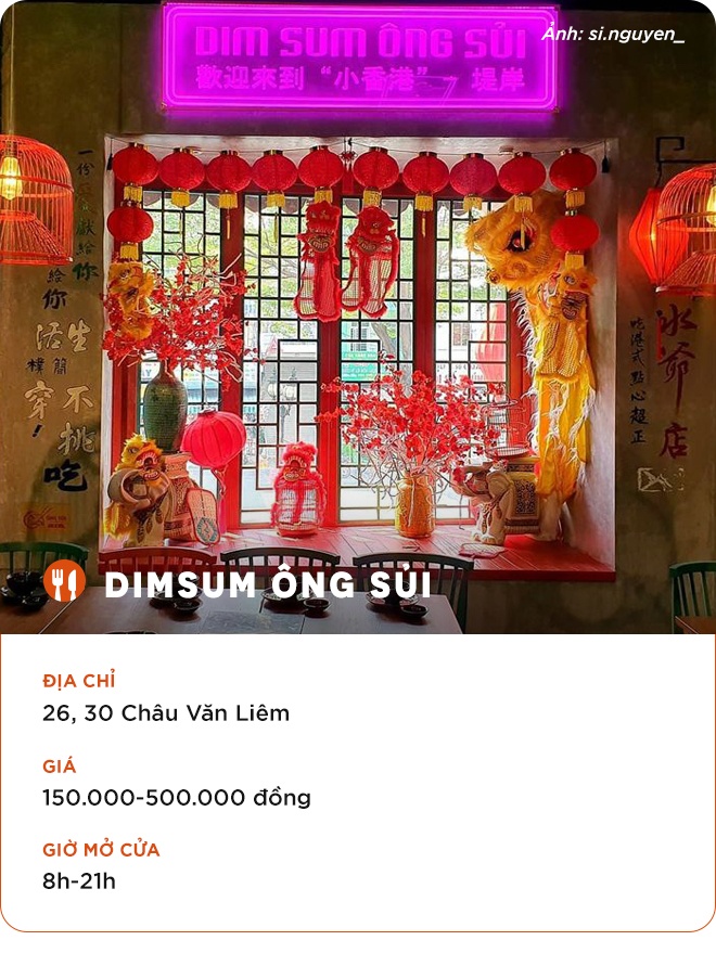 Đánh giá chung: Địa điểm này phục vụ các món ăn kiểu Hoa đặc trưng. Thực đơn chủ yếu là các món dimsum, các món à la carte đa dạng. Quán nhỏ nhắn, không gian lịch sự, được trang trí kiểu Hong Kong, phù hợp cho các cặp đôi hoặc nhóm từ 3-5 người. Nhân viên phục vụ nhanh, thân thiện.