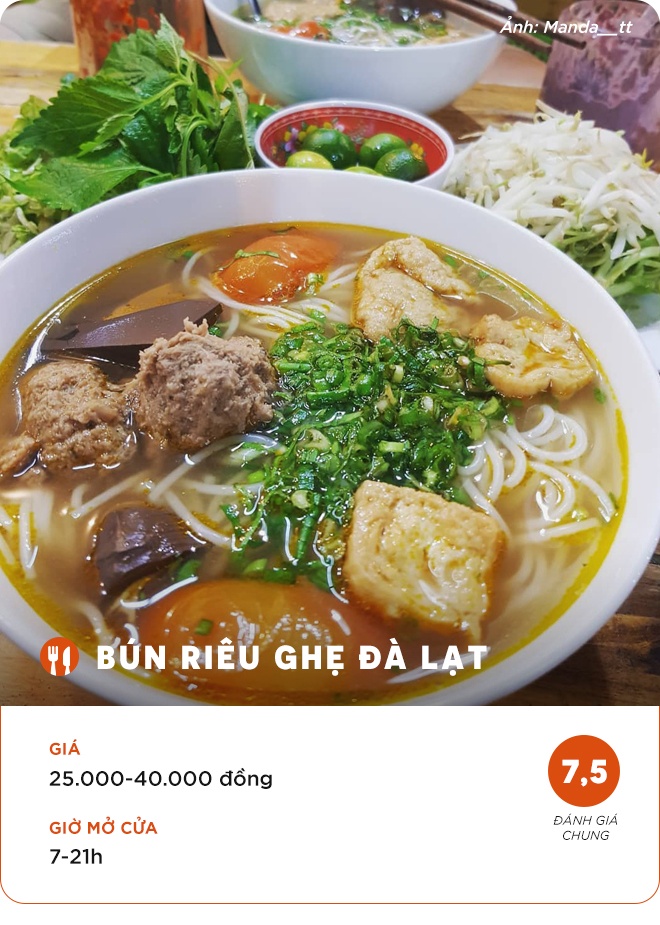 Đánh giá chung: Quán nổi tiếng với món bún riêu. Giá 45.000 đồng/tô. Bún ở đây gồm riêu cua, thịt giò, huyết, đậu hũ... Nước lèo ngọt thanh, không quá đậm đà. Rau ăn kèm tươi, sạch. Bún khá ít với những thực khách thích phần ăn đầy đặn.