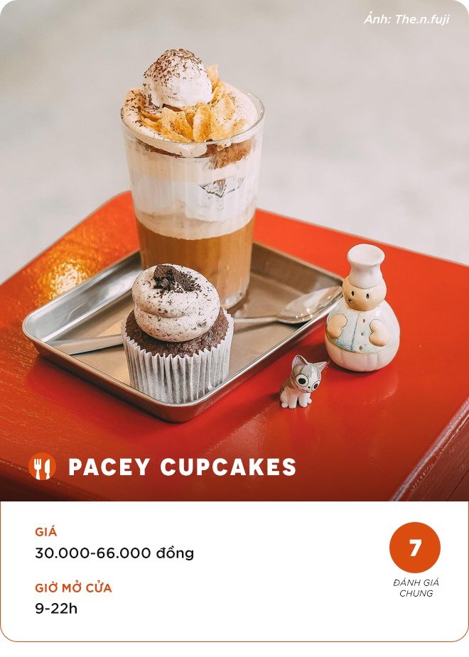 Đánh giá chung: Pacey là địa chỉ bán cupcake được nhiều thực khách tin tưởng ở TP.HCM. Ngoài cupcake, thực đơn của quán còn nổi bật với các món tráng miệng Parfait kiểu Pháp. Tùy theo vị thực khách chọn, quán sẽ kết hợp với bánh cupcake để tạo ra món nước lạ miệng và đẹp mắt.