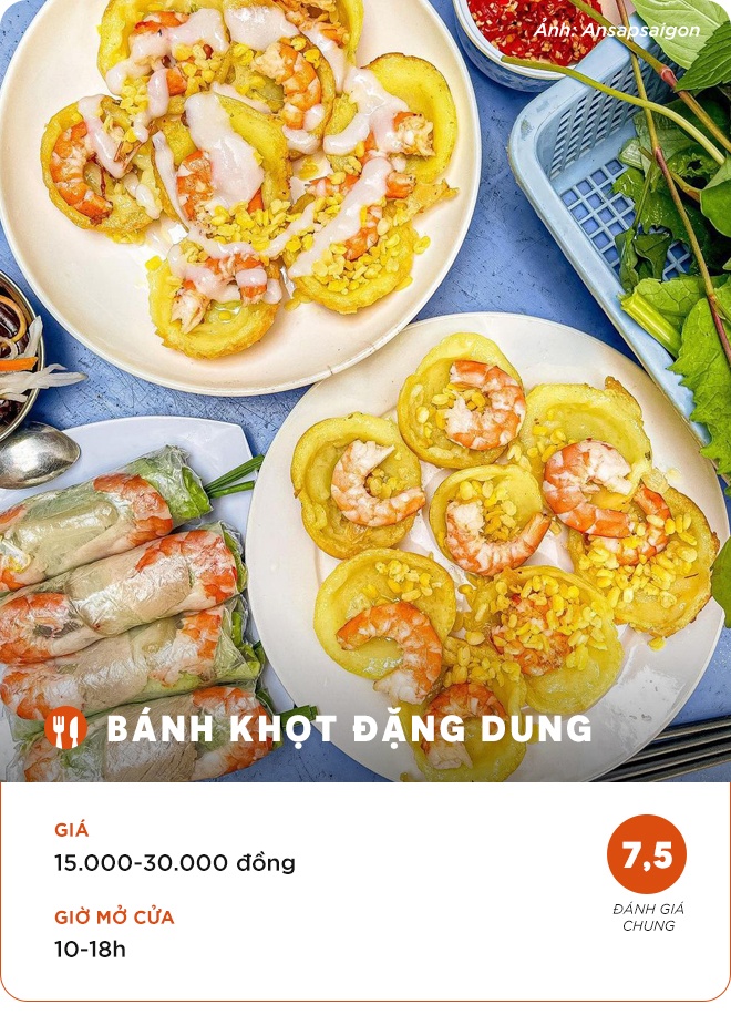 Đánh giá chung: Quán nằm trong hẻm nhỏ, nổi tiếng với bánh khọt. Vì hạn chế về không gian, đa số thực khách chọn mua về. Bánh khọt tại đây làm theo kiểu miền Tây đậm vị nước cốt dừa, đồ ăn thêm có đậu xanh và tôm. Giá một suất 8 bánh là 50.000 đồng. Ngoài ra, quán phục vụ thêm gỏi cuốn, bánh xèo...