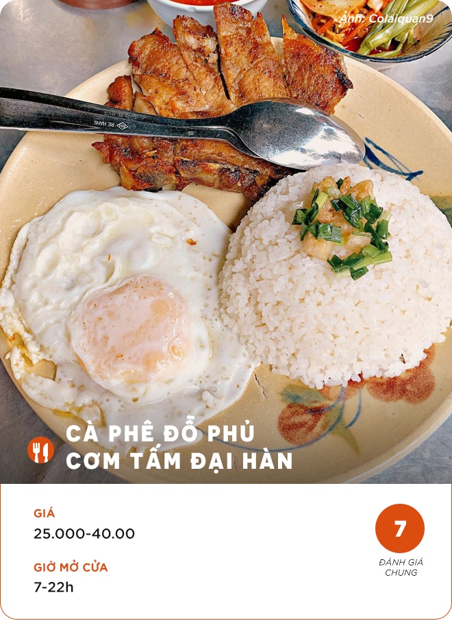 Đánh giá chung: Cà phê và cơm tấm là 2 món được thực khách yêu thích tại quán. Cơm tấm gồm 4 món ăn kèm là chả, bì, sườn, trứng với mức giá 30.000-45.000 đồng/suất. Ngoài ra, bạn có thể gọi các món khác như bánh bột lọc, mì gói thịt bò.