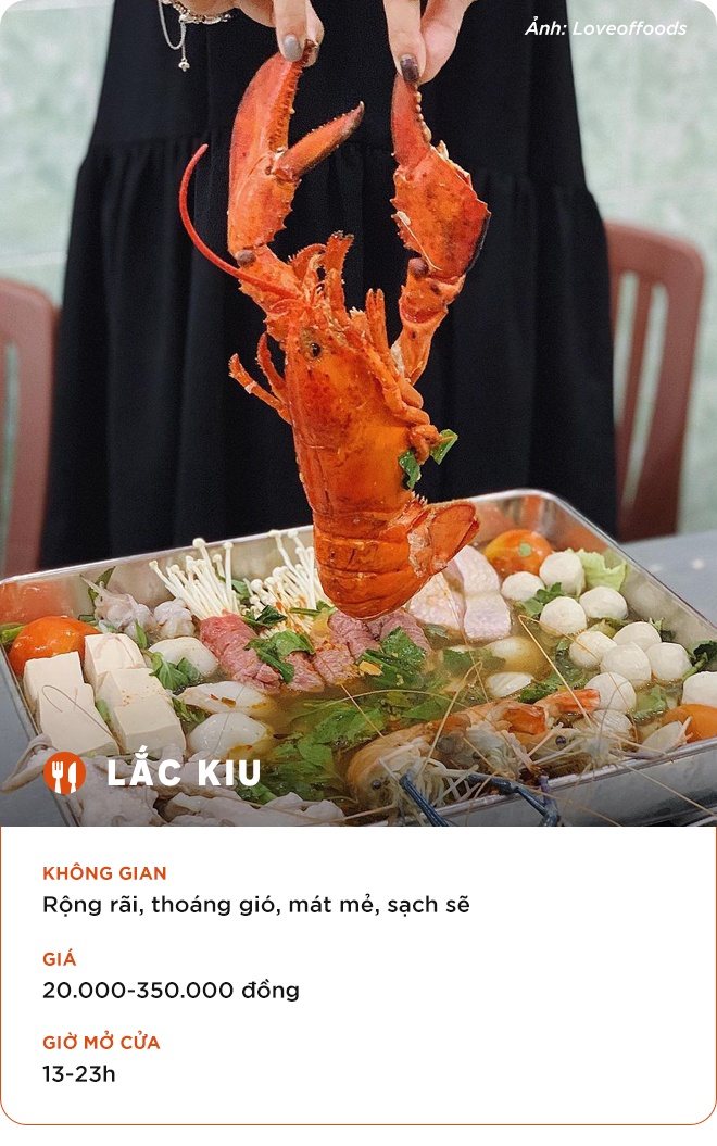 Đánh giá chung: Lắc Kiu là nhà hàng chuyên phục vụ các món hải sản. Quán có chỗ giữ xe trong nhà. Không gian phù hợp cho nhóm đông người. Các món có giá 50.000-500.000 đồng. Một phần lẩu 500.000 đồng cho 4-5 người ăn gồm tôm càng, tôm hùm, bạch tuộc, mực, chả cá, cá diêu hồng, nấm.