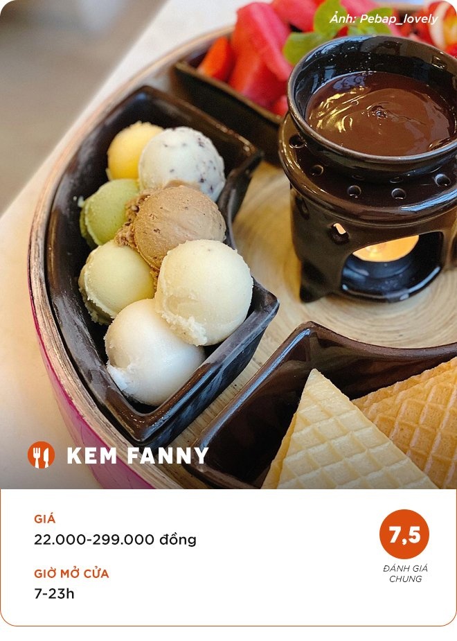 Đánh giá chung: Fanny là một trong những quán kem nổi tiếng ở TP.HCM. Kem ở đây được nhiều thực khách đánh giá cao về chất lượng cũng như giá cả phải chăng (từ 69.000 đồng). Để có nhiều sự lựa chọn, bạn có thể gọi lẩu kem với hơn 10 vị khác nhau.