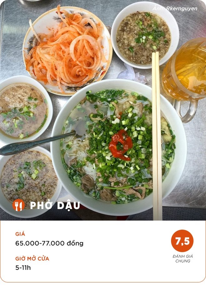 Đánh giá chung: Phở Dậu là quán ăn lâu năm và đông khách ở TP.HCM. Tô phở thường đi kèm bát hành tây bào mỏng, không có rau, giá đỗ hay tương đen như những nơi khác. Khi ăn, bạn trộn hành tây với phở, thêm đường, chanh để tăng vị chua, ngọt.