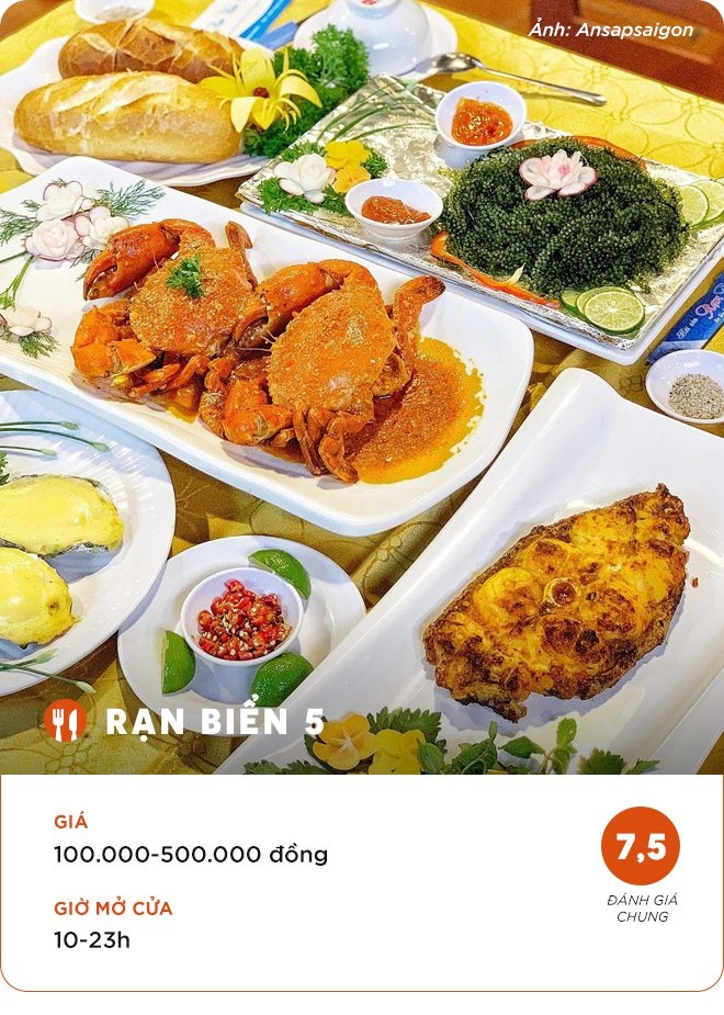 Đánh giá chung: Rạn Biển 5 là quán hải sản tươi sống có khá nhiều chi nhánh ở TP.HCM. Không gian lịch sự, thích hợp cho các bữa tiệc cùng gia đình hoặc công ty, đối tác. Hải sản đa dạng, tươi sống. Thực khách có thể tới bể chọn hải sản để chế biến tại chỗ.