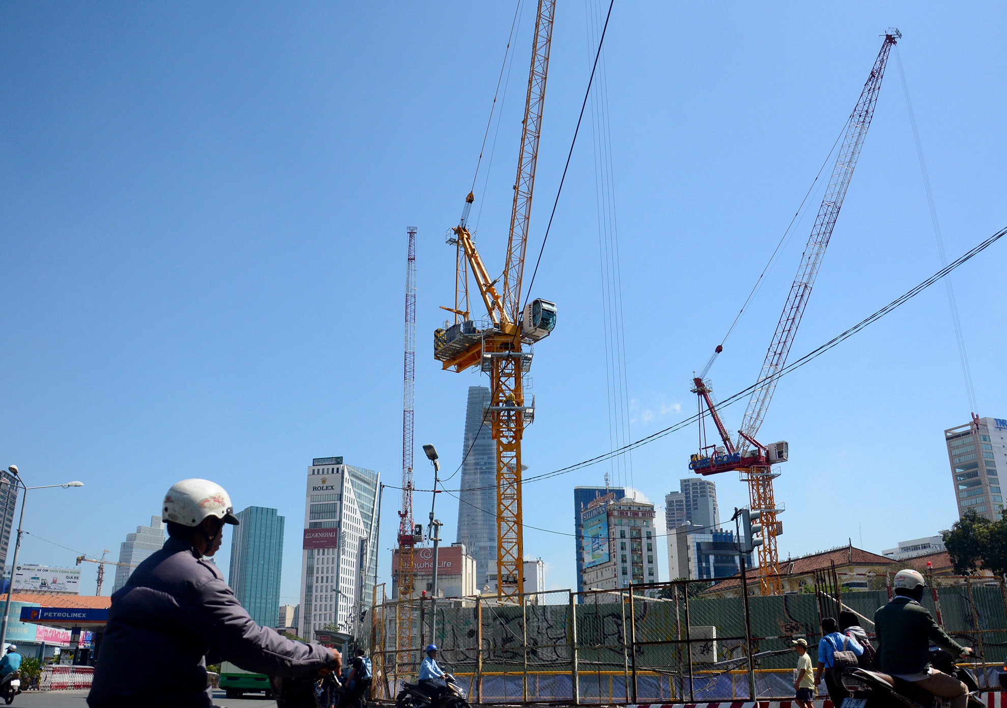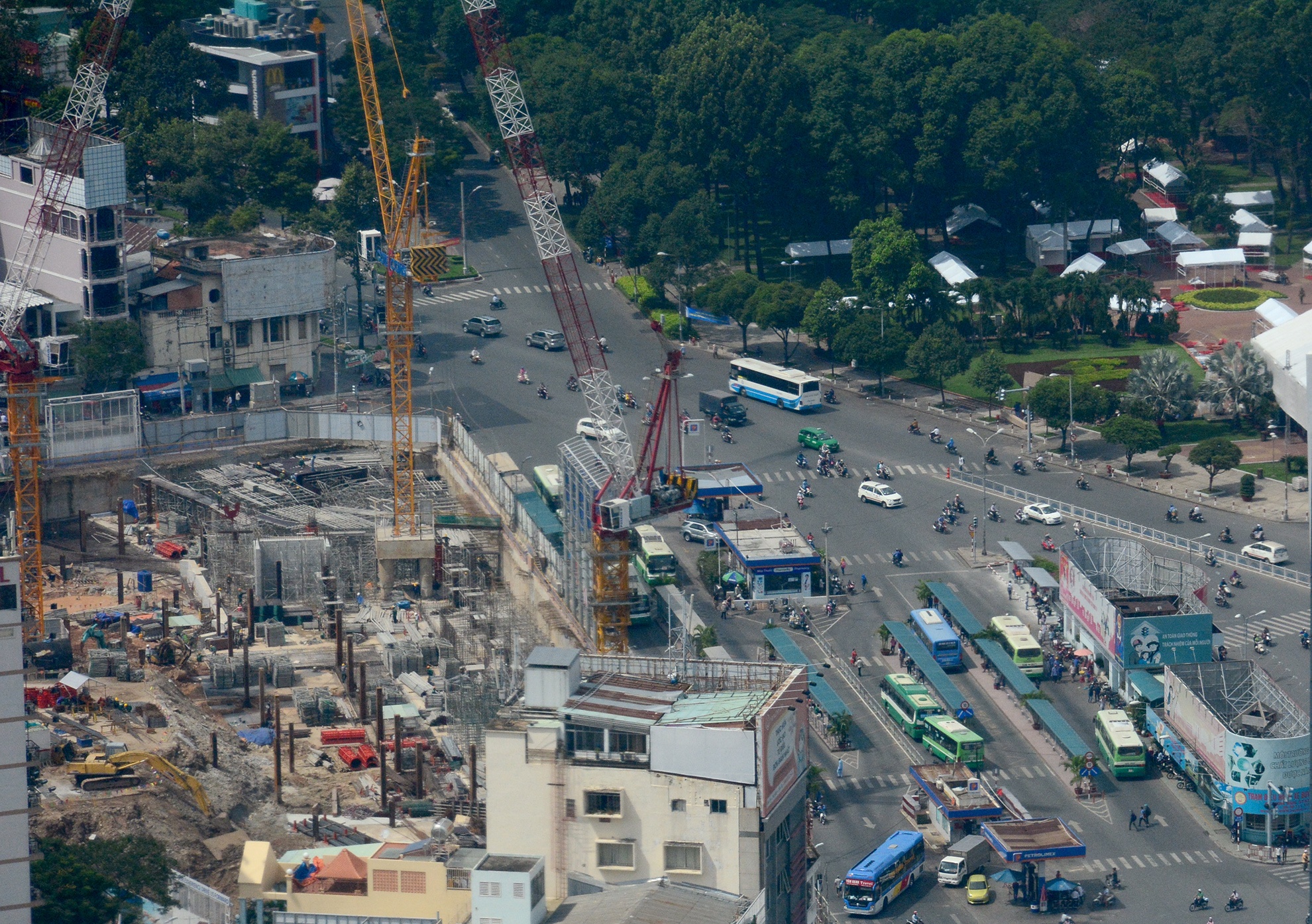 | Tại TP Hồ Chí Minh: Ba chiếc cẩu tháp hoạt động trên công trình bên cạnh trạm xe buýt trước chợ Bến Thành, quận 1. |