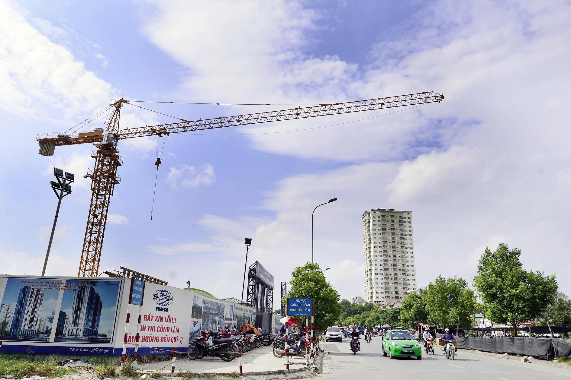Trong khu đô thị Nam Trung Yên, chiếc cần cẩu cao đứng ngay cạnh công trình đang xây dở phần móng.