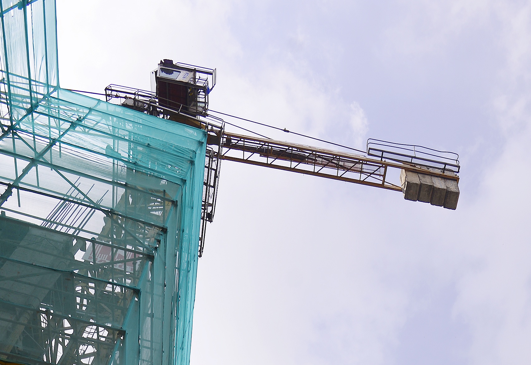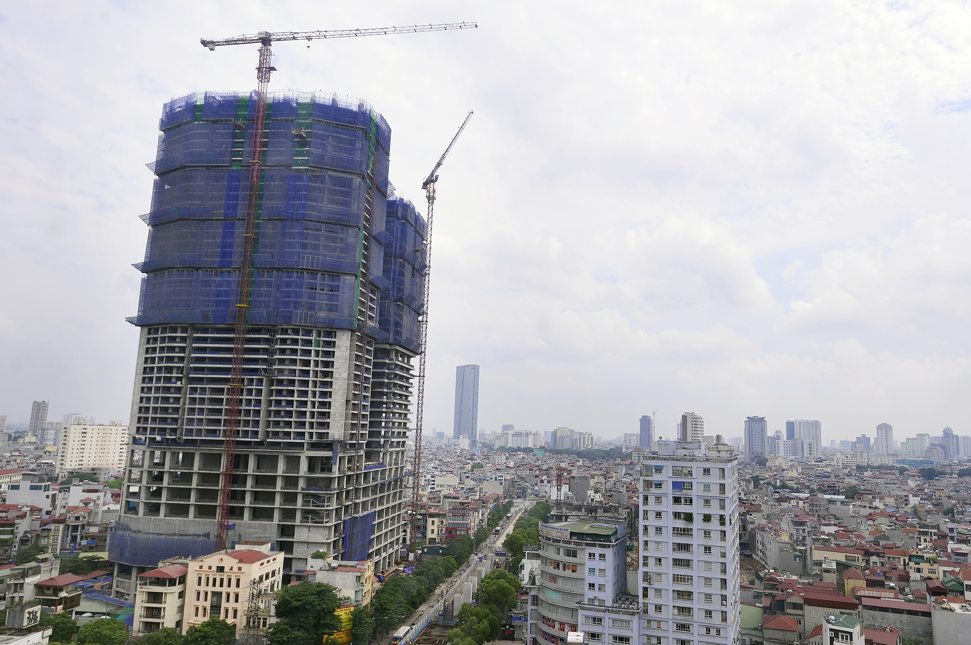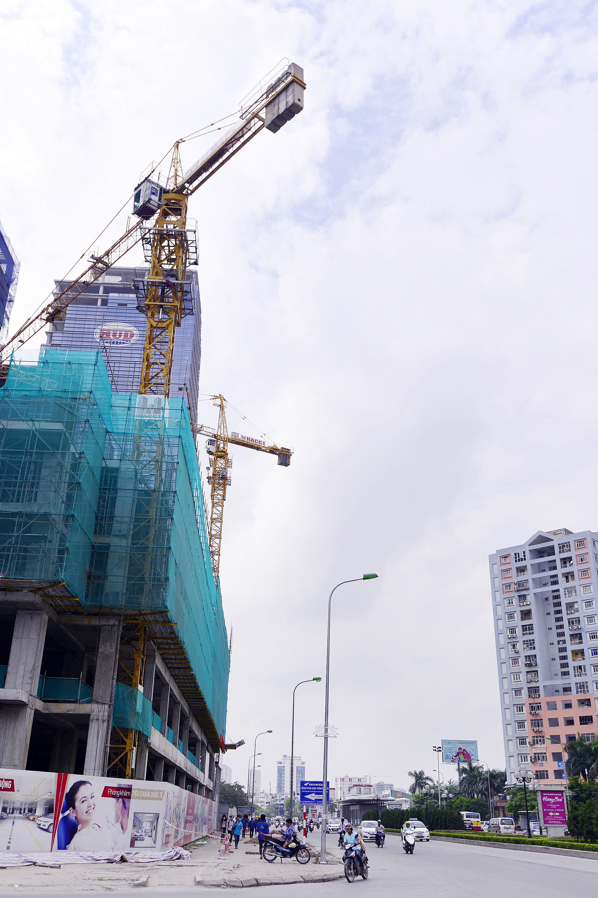 | Một công trình cao tầng tại quận Cầu Giấy, hai chiếc cần cẩu làm việc ngày đêm liên tục hướng ra ngoài đường, nơi có mật độ người tham gia giao thông cao. |