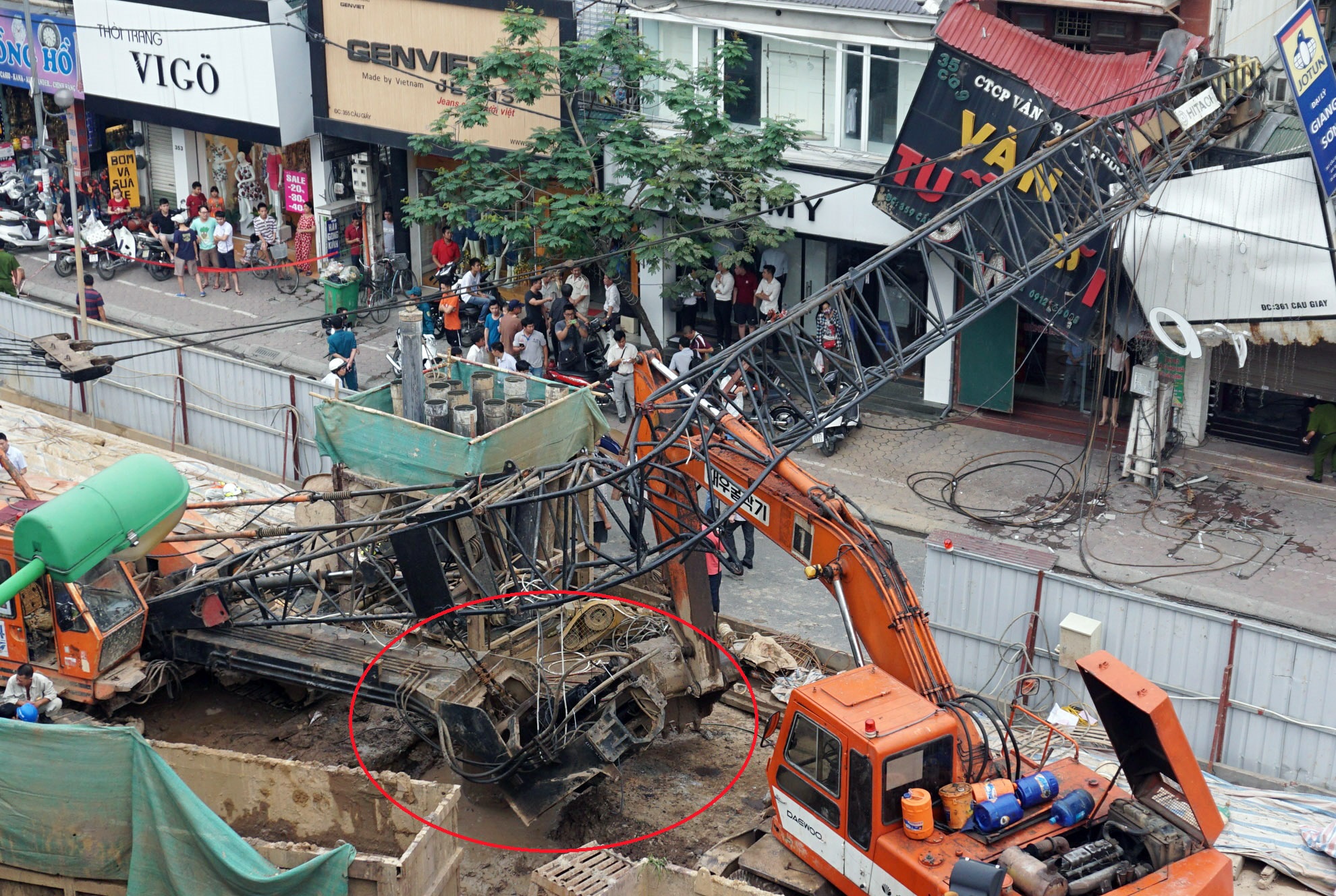 Còn tại Hà Nội, chiều 12/5, một chiếc cần cẩu bất ngờ đổ sập, vắt ngang đường đè vào mái nhà dân làm hỏng biển quảng cáo của cửa hàng vàng bạc và thời trang trên đường Cầu Giấy (Hà Nội). Đây là công trường dự án đường sắt đô thị Nhổn - ga Hà Nội.