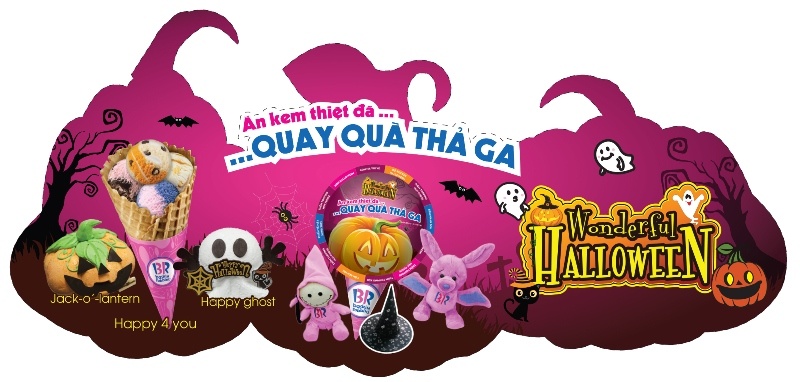Chương trình kéo dài từ 25/9 - 31/10, thời gian khá dài để bạn cùng sưu tập trọn bộ quà tặng độc đáo: chiếc mũ phù thủy huyền bí, túi kẹo “Trick or Treat”, bộ sticker viên kem xinh xắn ngộ nghĩnh, gấu bông ma trơi và dơi “siêu dễ thương”... hoặc bạn sẽ được trang trí Halloween miễn phí vào ngày 31/10 và tha hồ úp Facebook.