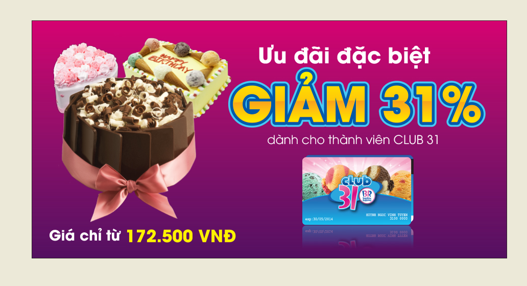 Ngoài ra, bạn còn được ưu đãi giảm 31% dành cho chủ thẻ Club31. Bánh Kem Lạnh tại Baskin Robbins giá chỉ từ 172.500 đồng trở lên với rất nhiều kiểu bánh xinh xắn, dễ thương.