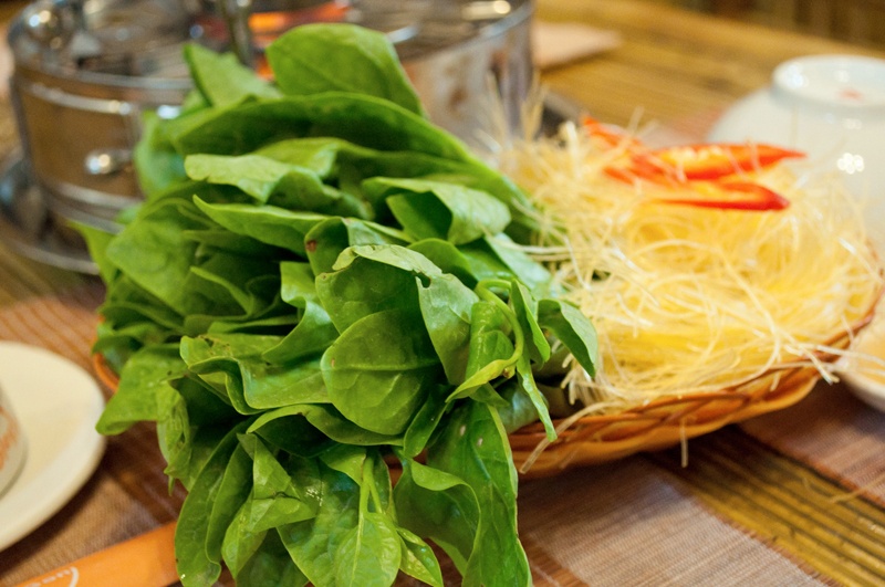 Lẩu bao tử hầm tiêu chắc chắn là mới lạ với người Hà Nội. Nghe tên món không thực sự hấp dẫn nhất là với những khách sợ đồ nội tạng. Ngay cả khi nhân viên bưng ra set lẩu, nhiều người cũng chẳng dám kì vọng. Vỏn vẹn có đĩa rau mồng tơi kèm miến cùng niêu nước lẩu nho nhỏ trông cũng kém bắt mắt – trong trong, nhàn nhạt với những miếng củ cải ngọt và bảo tử trắng trắng, thi thoảng lấm tấm thêm hạt tiêu đen.