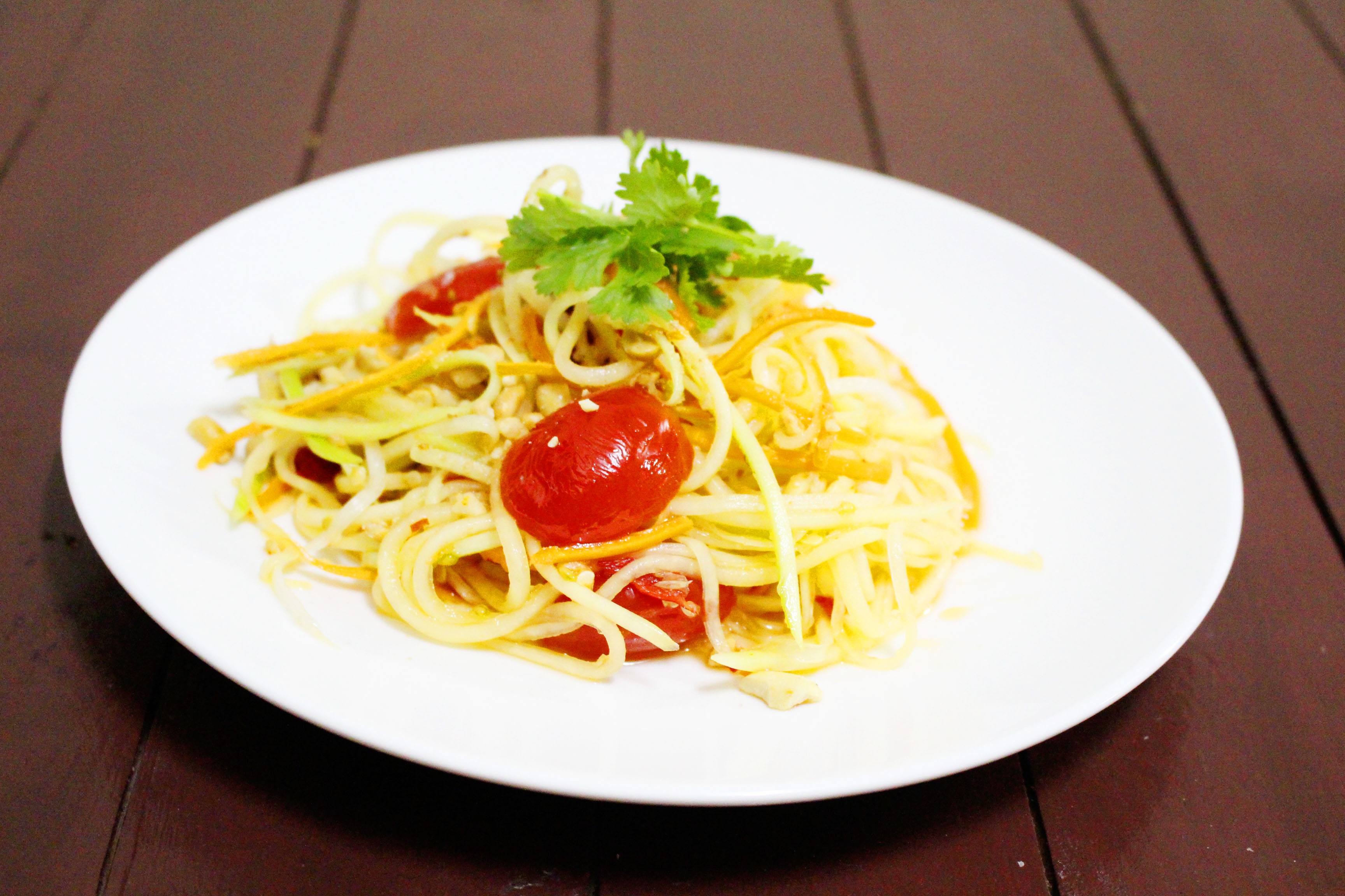 Món đầu tiên bạn nên thưởng thức tại đây là gỏi đu đủ. Món này có cách làm khá đơn giản. Đu đủ và cà rốt thái sợi, ngâm sơ với nước muối loãng và chanh, vắt ráo. Hỗn hợp nước trộn gỏi được làm từ nước mắm, ớt, tỏi, chanh và một loại sốt được chủ quán nhập trực tiếp từ Thái. Khi có khách gọi món, đầu bếp sẽ xếp đu đủ và cà rốt vào đĩa, chan nước sốt và cuối cùng là rải đậu phộng lên trên.