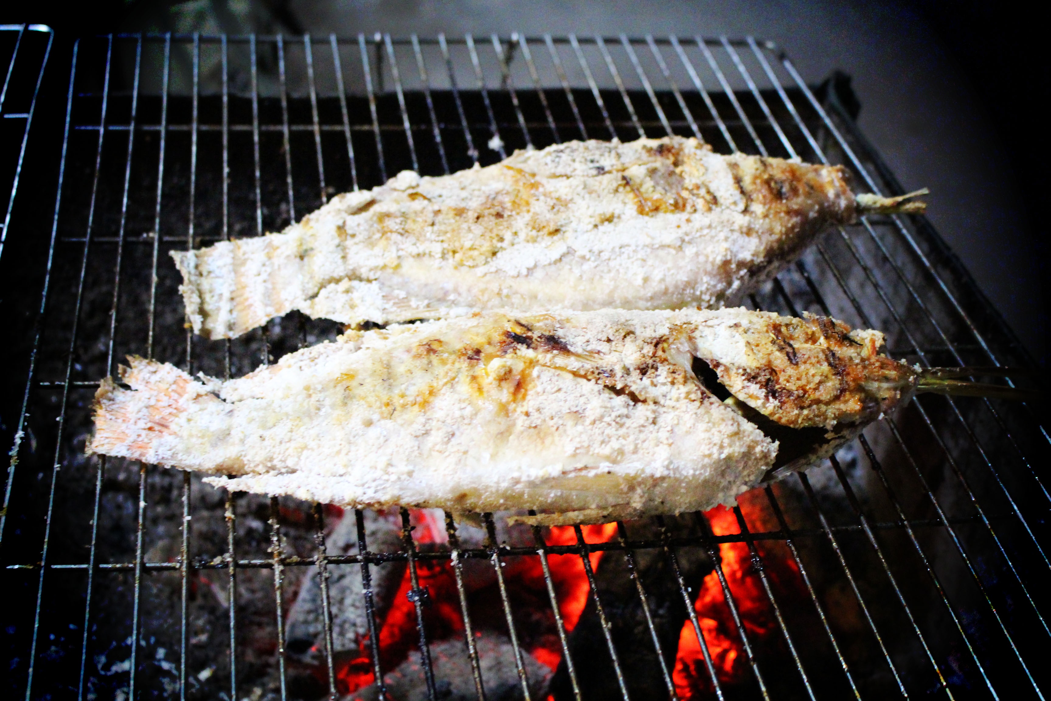 | Cá được ướp một lớp muối hột thật dày trước khi nướng. |