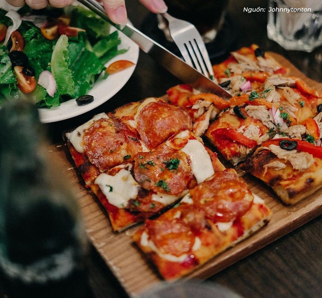 Khác với nhiều nơi, để bánh pizza tại đây được làm thành miếng chữ nhật lạ mắt, chia thành các loại gồm bánh 2 miếng và 4 miếng. Ngoài pizza, quán cũng phục vụ nhiều loại salad rau củ. Các loại salad dao động từ 40.000-120.000 đồng. Pizza miếng 15x10 cm giá khoảng 60.000 đồng, nửa khay 14 cm giá 120.000-220.000 đồng (4 miếng), nguyên khay 28 cm (8 miếng) dao động 230.000-300.000 đồng