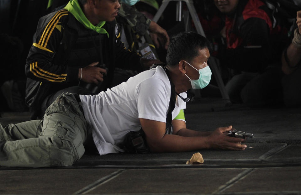 | Một người chống chính phủ sử dụng súng lục khi đối phó với lực lượng an ninh và những người ủng hộ chính phủ tại Bangkok hôm 1/2. Ảnh: AP |