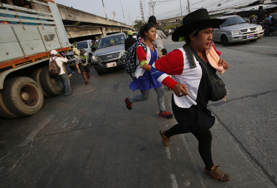 | Những người biểu tình chạy khi vài tiếng súng vang lên hôm 1/2. Ảnh: Reuters |