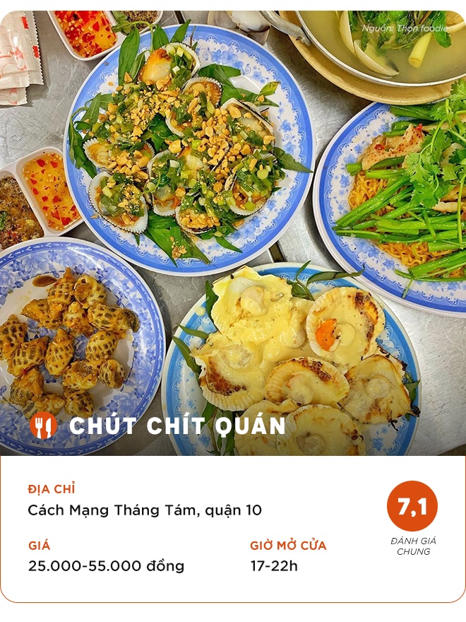 Chút Chít Quán cũng là một trong những địa chỉ yêu thích của giới trẻ. Thực đơn ở đây phong phú, gồm ốc, nghêu, sò, cơm chiên... Các nguyên liệu được lựa chọn tươi ngon, chế biến vừa miệng.