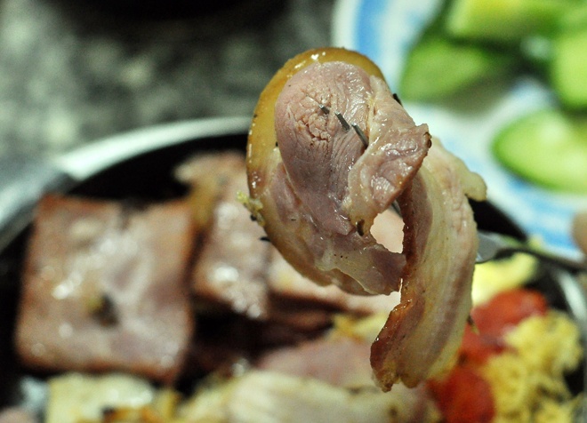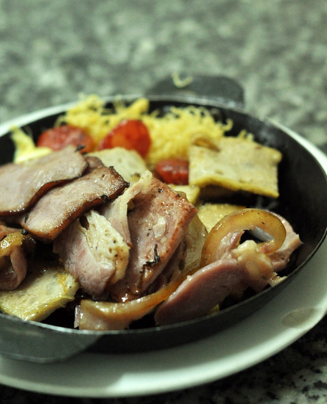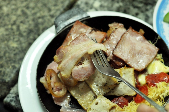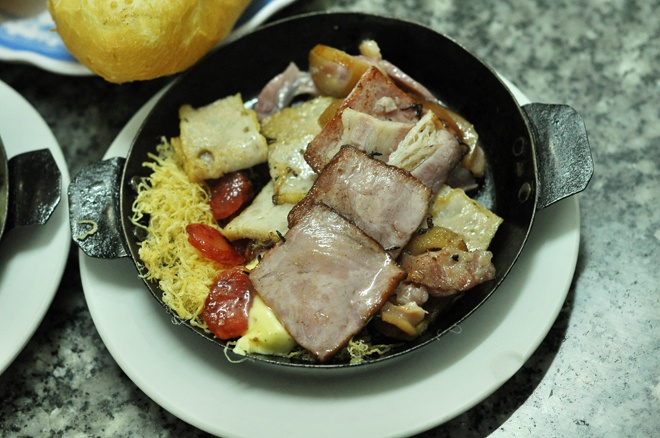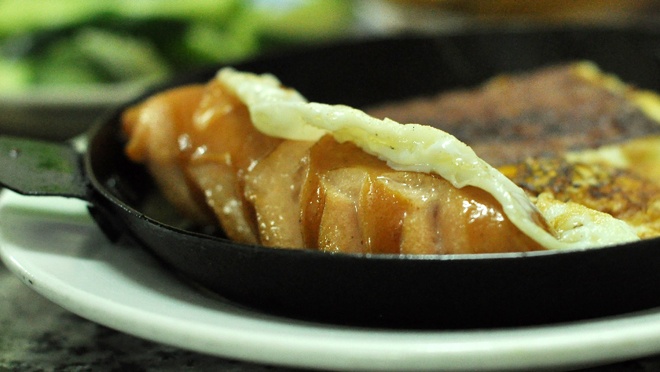 Tuy nhiên, nếu nói quán này là địa chỉ “ngon rẻ” thì chưa phải. Vì nếu lỡ mồm gọi chảo khác kiểu đi, bạn sẽ thấy khác ngay. Chẳng hạn như khi nhân viên bưng ra cho bạn một chảo có chừng đôi ba miếng thăn, vài miếng ba chỉ, 1-2 lát chân giò, kèm thêm chả mỡ, ít ruốc nữa, nom hấp dẫn, ngon mắt nhưng giá cũng đẹp không kém - 65.000 đồng. Có lẽ vì thịt ở đây không phải loại thịt mỡ hay ba chỉ như các cửa hàng bánh mì pate thông thường, quán này họ sử dụng thịt nguội hay thịt xông khói nên giá đội lên nhiều. Trông có vẻ đầy đặn vậy song với người “phàm ăn”, suất 65.000 này chắc vẫn chưa “đủ đô”.
